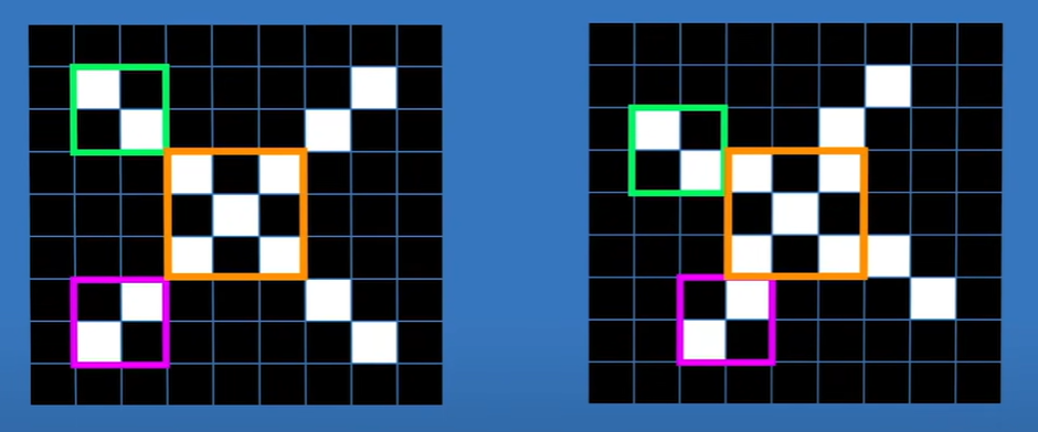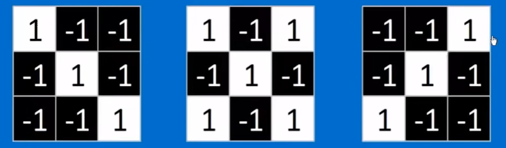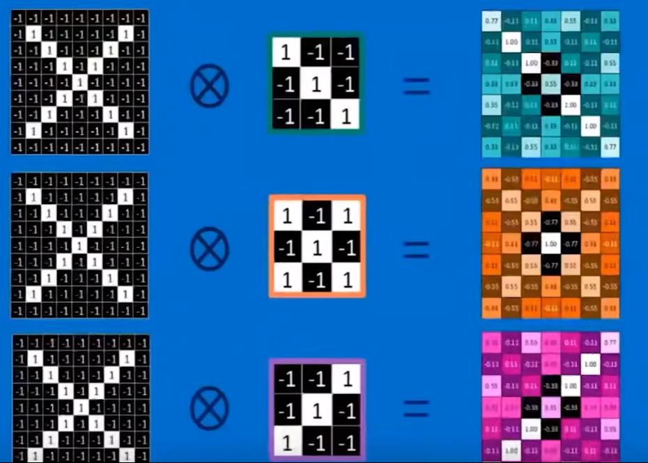 回到上图的识别x的问题,通过三个卷积核则可以过滤出来被框出来的三个特征