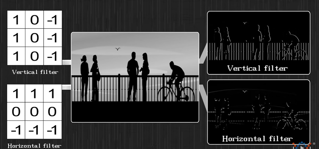 卷积操作还有个功能:如果挑选的卷积核合适,那么就可以对图片进行过滤,把某些特征保存下来,过滤掉其他特征。这样的卷积核也叫做过滤器,所以上图的两个卷积核分别叫做垂直边界过滤器和水平边界过滤器