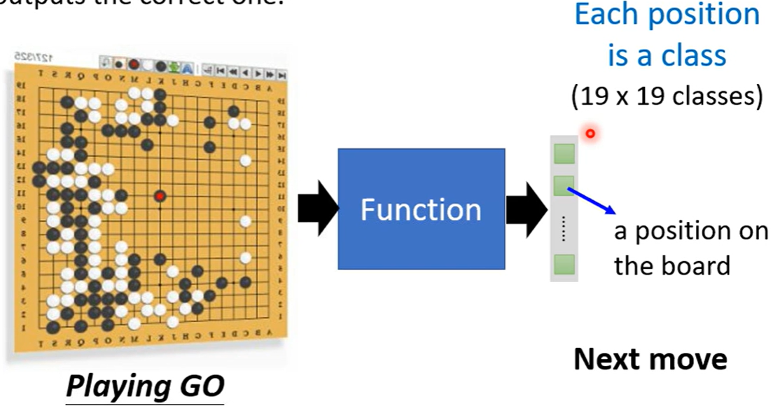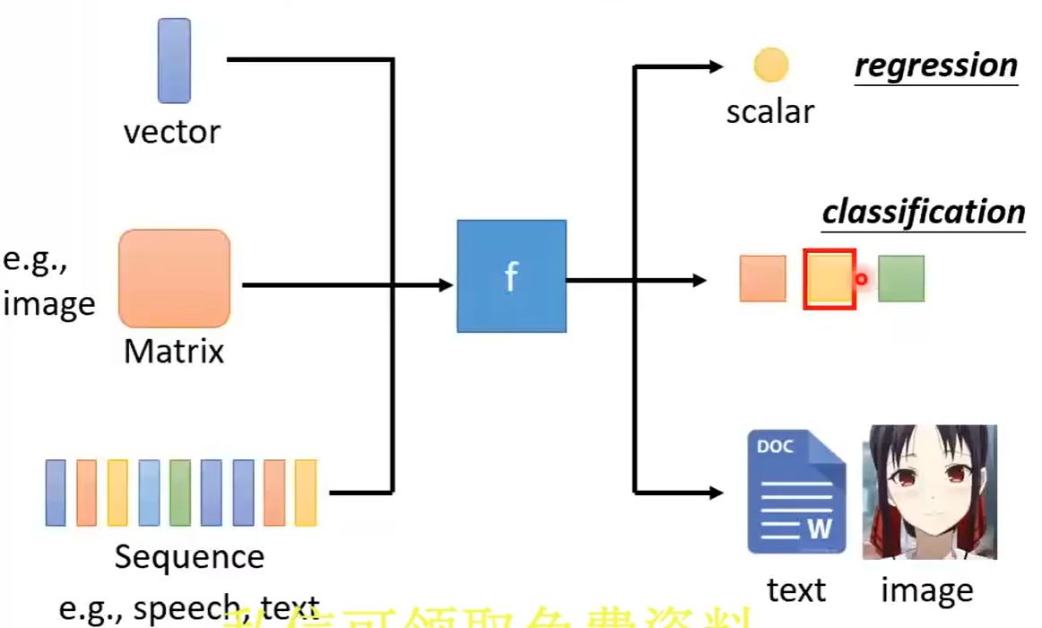 其输入可以是一个向量、一个矩阵、也可以是一个序列,输出可以是一个数值(此任务叫做regression回归任务)、可以是一个类别(此任务叫做classification分类任务)、也可以叫机器写一段话写一篇文章
