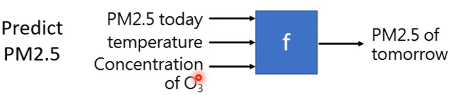 - Regression:回归,找到的函数输出是一个数值。比如:预测未来某一个时间pm2.5的数值