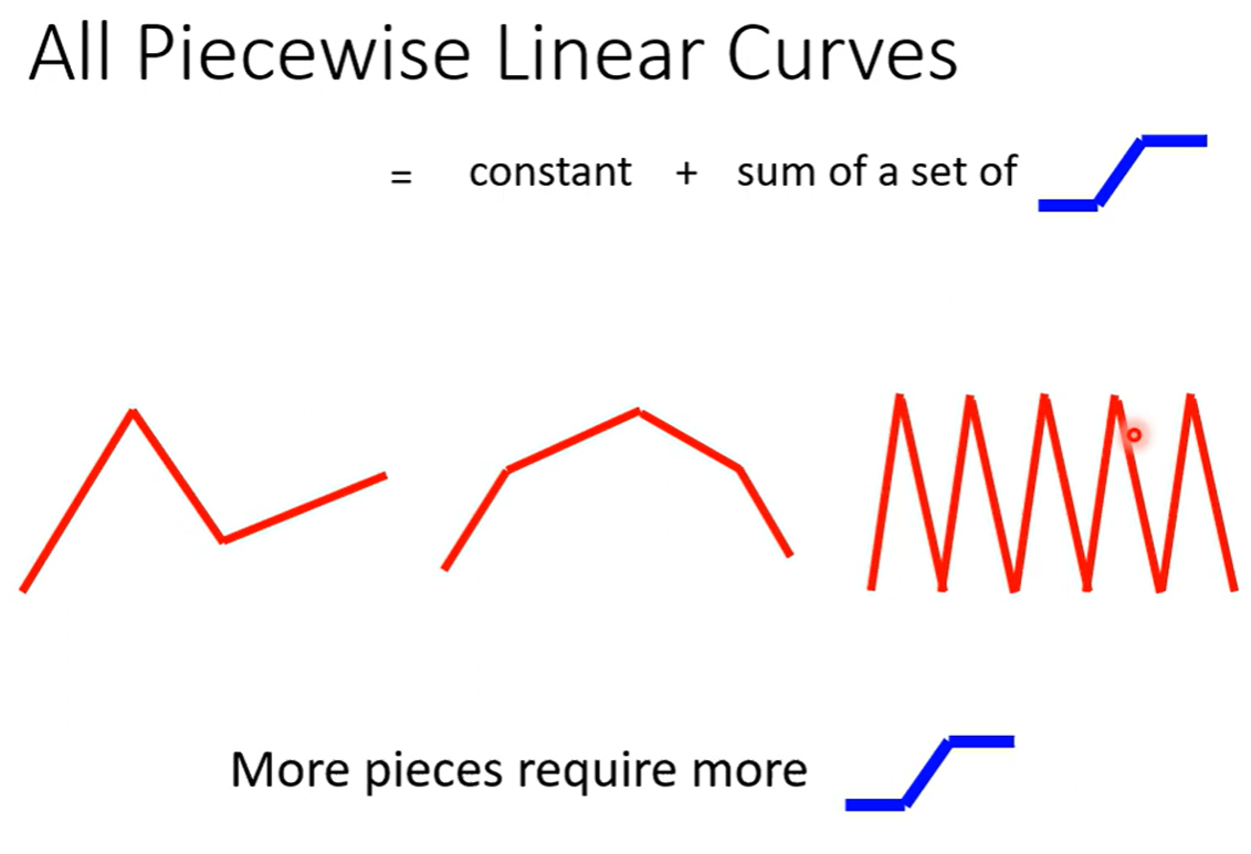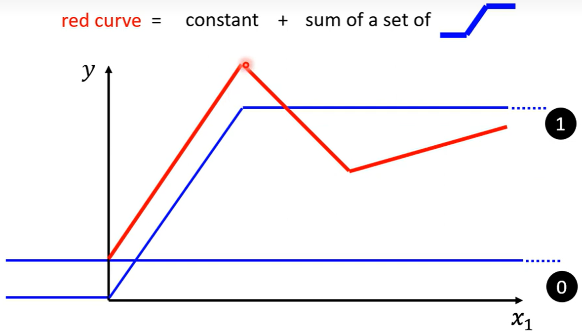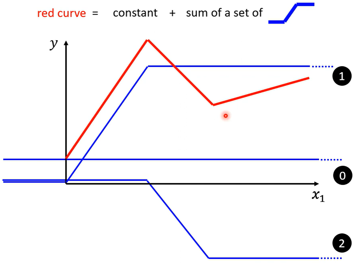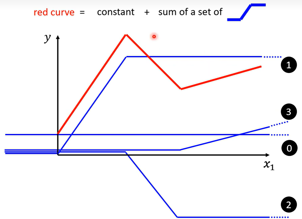 Piecewise Linear(分段线性函数)的Curves(曲线)都有办法用常数项加一大堆的蓝色函数组合起来,如果分段函数的转折点越多越复杂,则需要的蓝色函数就会越多