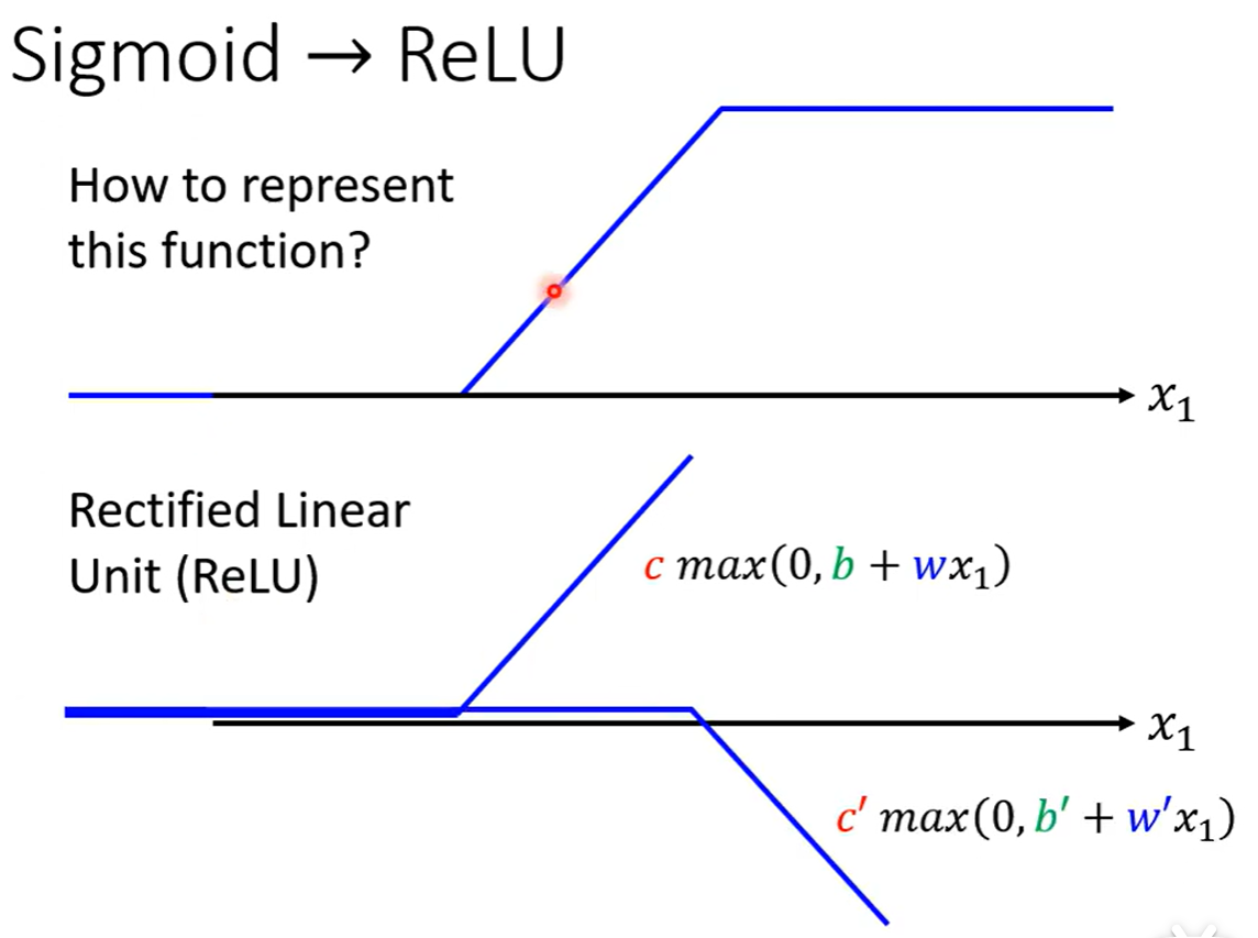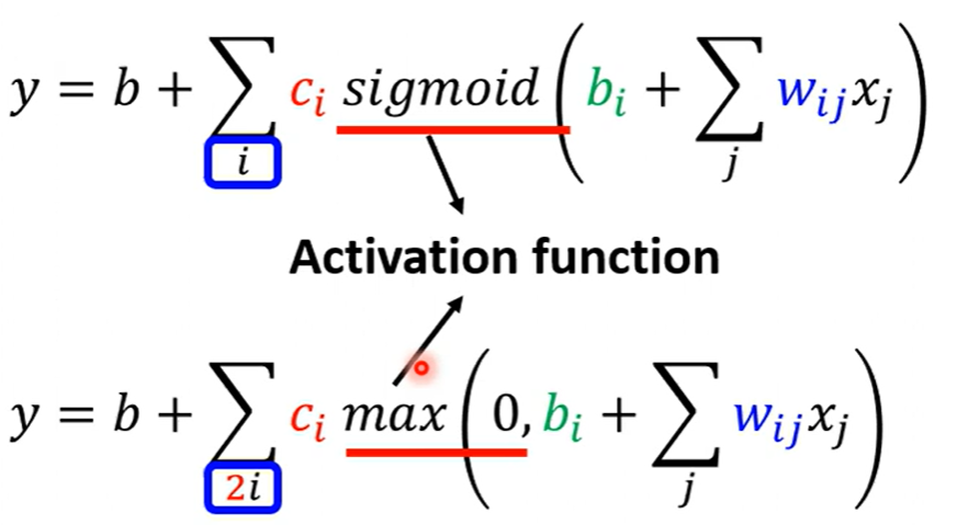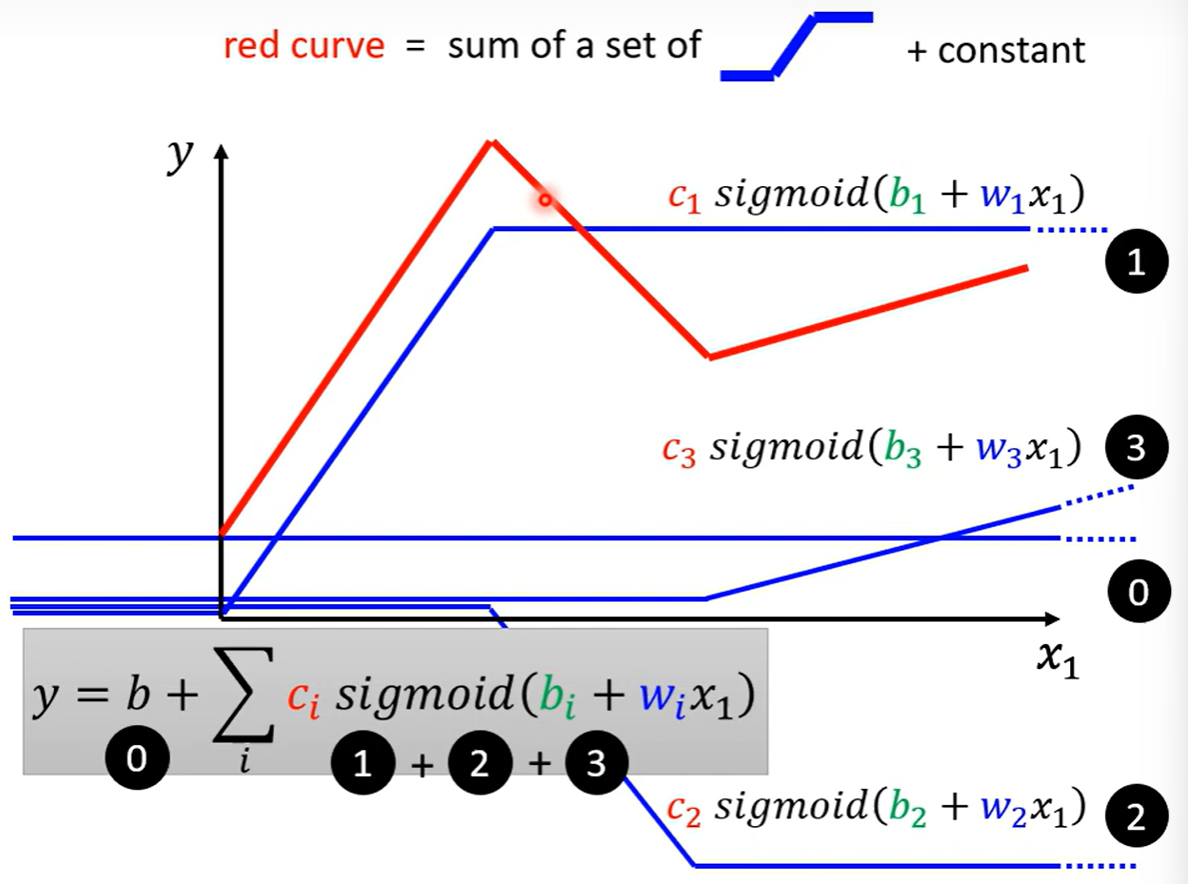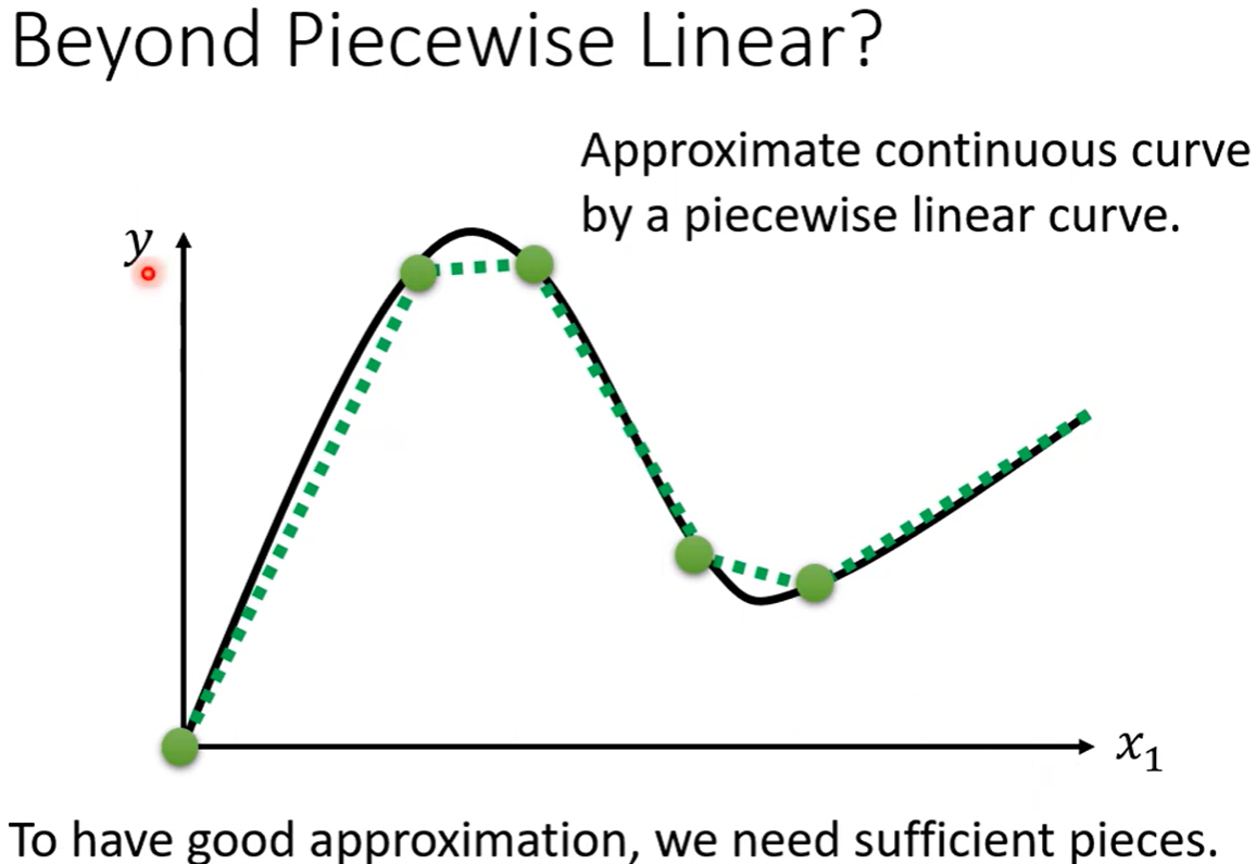 Piecewise Linear(分段线性函数)的Curves(曲线)都有办法用常数项加一大堆的蓝色函数组合起来,如果分段函数的转折点越多越复杂,则需要的蓝色函数就会越多