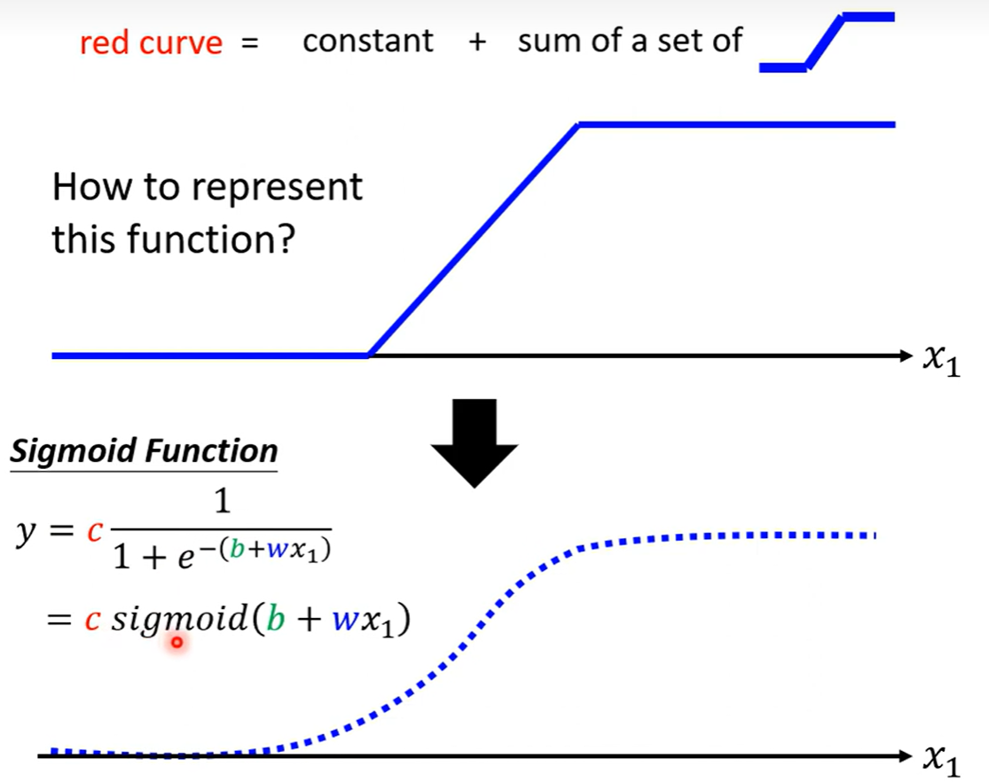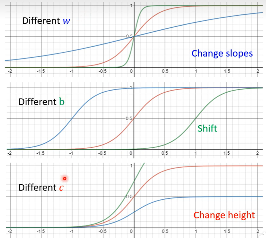 我们需要各种的各式各样的hard sigmoid函数所以就可以通过调整不同的w、c和b来制造各式各样的斜率的蓝色函数,不同的w有不同的坡度,不同的b会让函数左右移动,不同的c会让函数有不同的高度