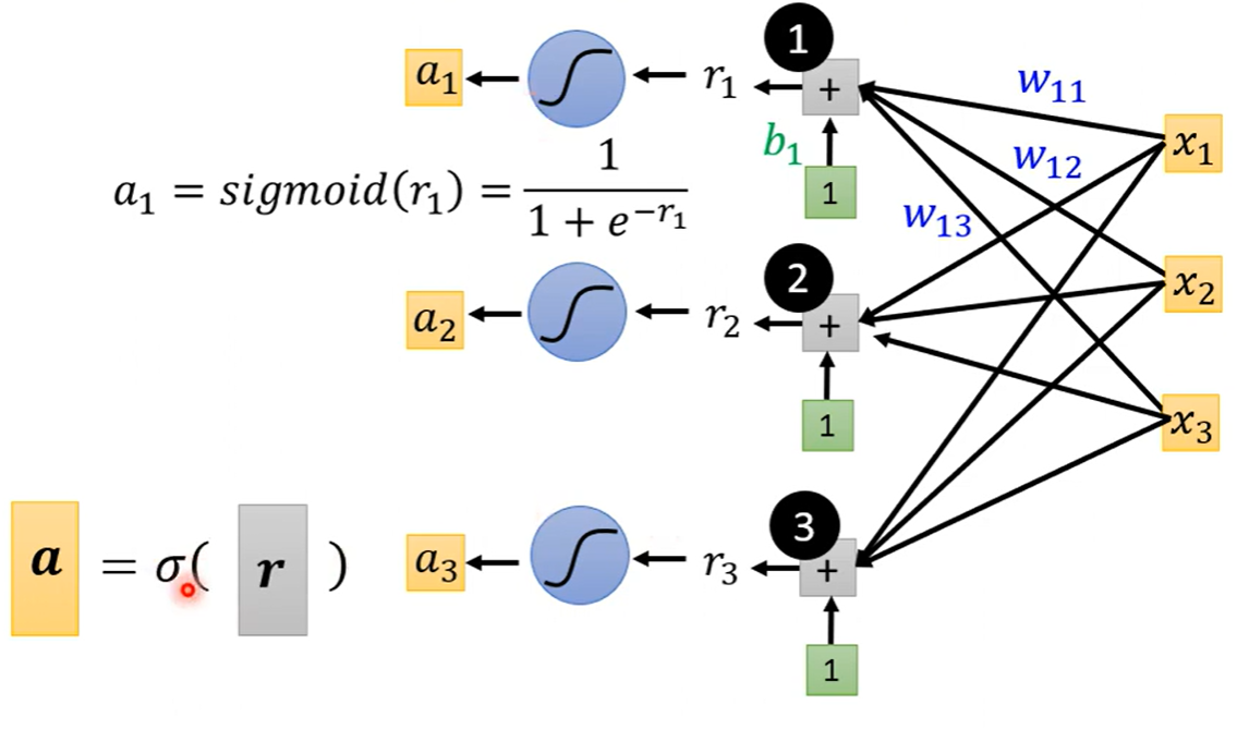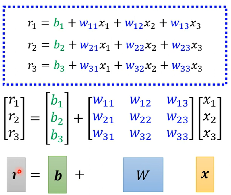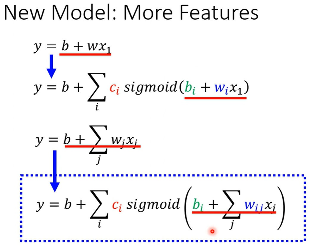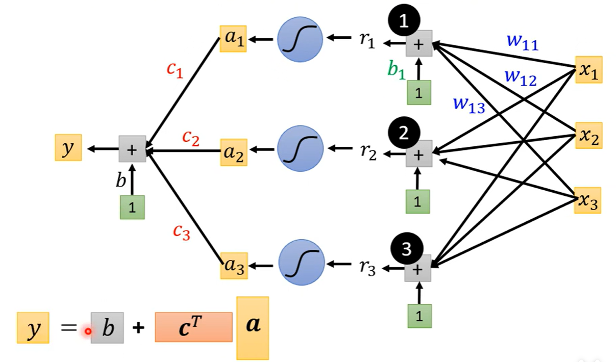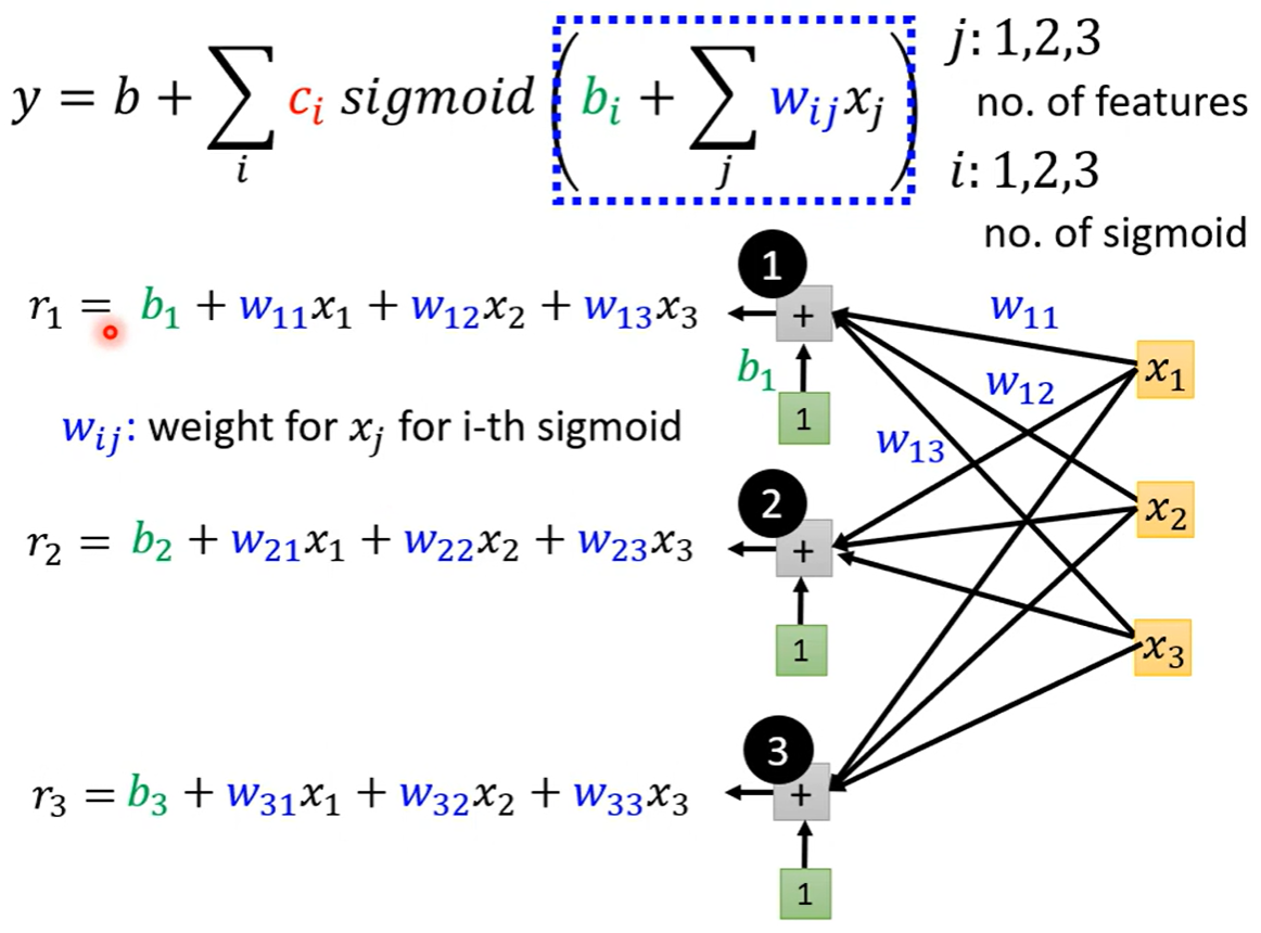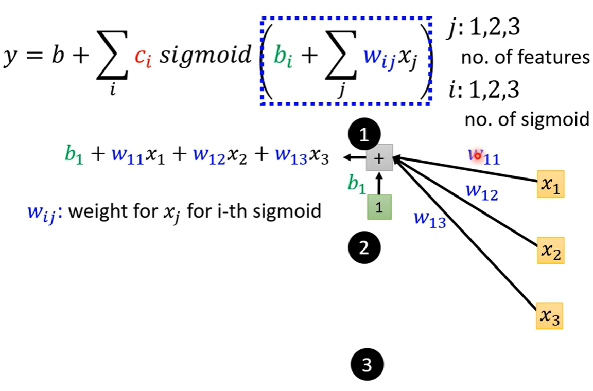如果只考虑前三天的观看人数,其中j的取值是1、2、3表示前一天到三天的观看人数,i的取值也是1到3,每一个i代表也一个蓝色的函数,每一个x都乘以对应的w再相加最后加上b这是一个sigmoid函数里面的内容