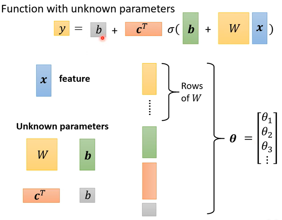 将所有用到的数值进行分类,其中x叫做feature特征项,其余的都是位置参数,如果将这些参数进行整合,得到的一个很长的向量,称为θ,其内容是来自于各个未知参数。所有的未知参数都统称θ