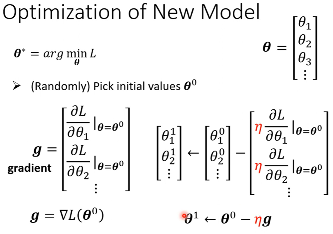 要计算θ的最小值θ*,则要先选定一个初始值θ0,之后对θ里面的每一个值进行偏导数的微分,之后的结果集合起来就是一个向量g(名字叫做gradient)之后进行参数θ的更新,直到参数无法再更新,找到了局部最优解(不一定是全局最优)