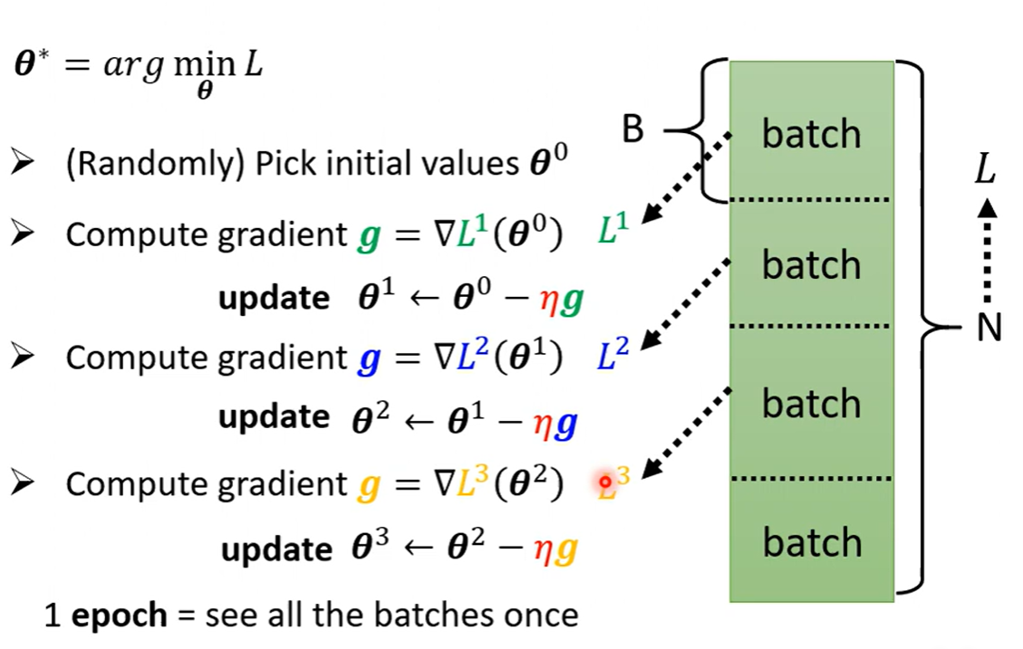 在实际实验中通常并不是使用全部的数据进行计算,而是将数据随机分成batch之后用不同的batch计算出不同的gradient,把所有的batch都使用一次,叫做Epoch,每一次更新参数叫做一次update