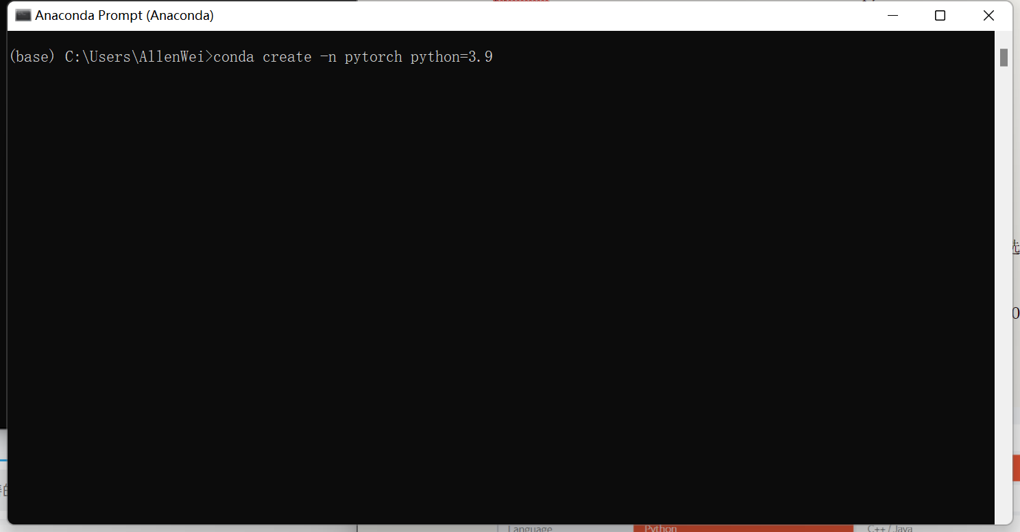 conda是指使用conda包,create是创建的意思,-n是指后面的名字是屋子的名字,pytorch是屋子的名字(可以更改成自己喜欢的),python=3.9是指创建的屋子是python3.9版本的。