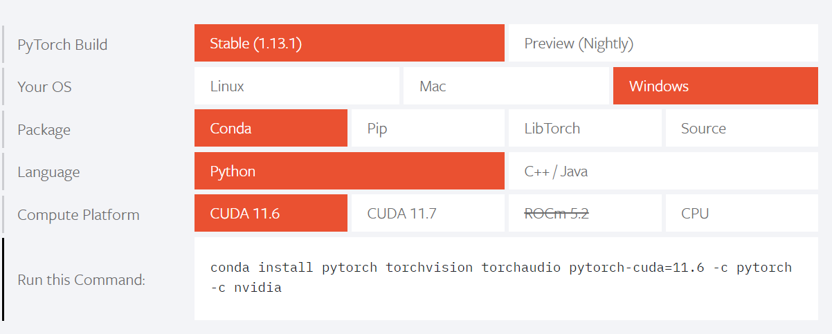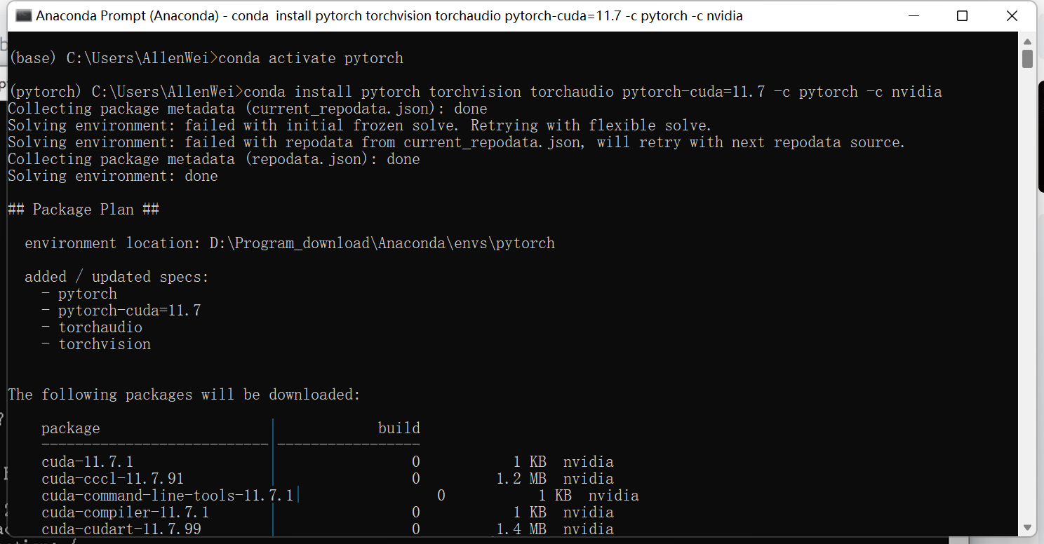 (2)打开anaconda的命令提示行前面已经创建了pytorch的环境,在此处输入conda activate pytorch再把上面的第六行的命令粘贴进来,这里11.6版本安装失败,我又改成了11.7版本
