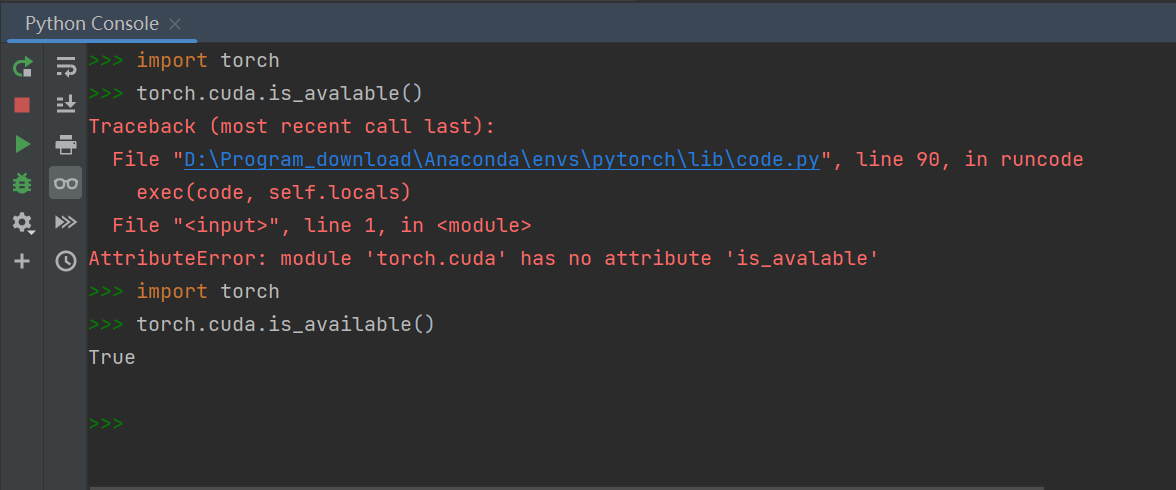 (4)下载好pytorch之后,在pycharm官网下载ppycharm编译器并导入pytorch环境,在python console中输入import torch若什么都不显示再输入torch.cuda.is_available()若显示True则环境配置成功