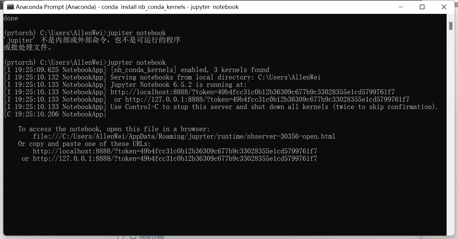 先在anaconda的小黑框里面输入conda activate pytorch,之后再安装一个包输入conda install nb_conda,python3.9版本的使用conda install nb_conda_kernels命令符。安装完成之后输入jupyter notebook,后打开网页版的jupyter
