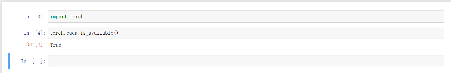 再输入import torch,按住shift+enter则跳转到下一个代码块,运行了代码块前面会有数字,再输入torch.cuda.is_available()