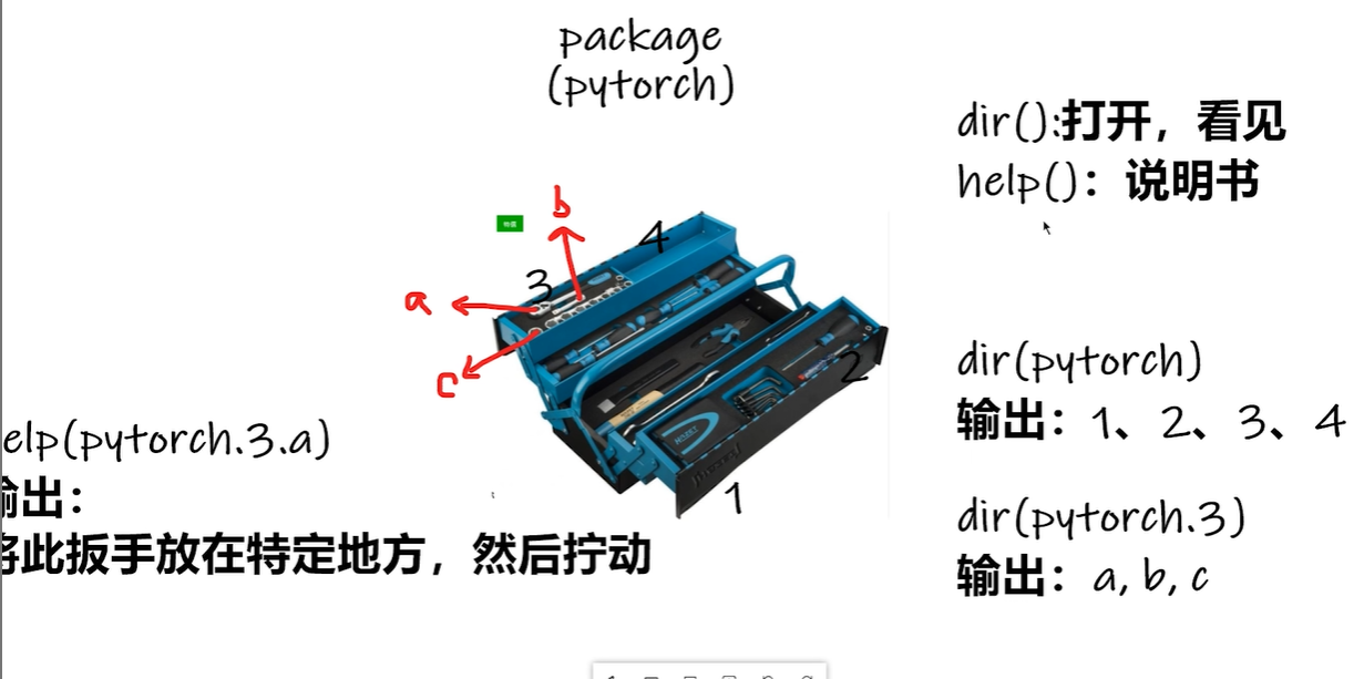 继续探索函数里面有什么就是dir(pytorch.函数3)==>会输出a、b、c