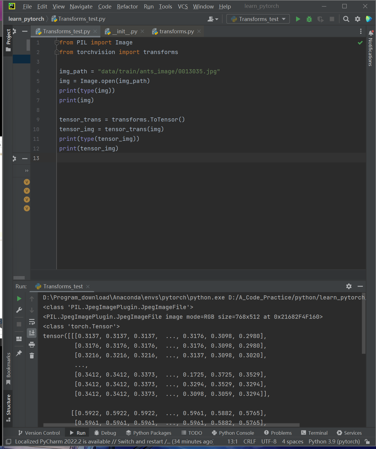如果要进行pytorch进行使用,则应该用transforms进行转化成tensor数据类型