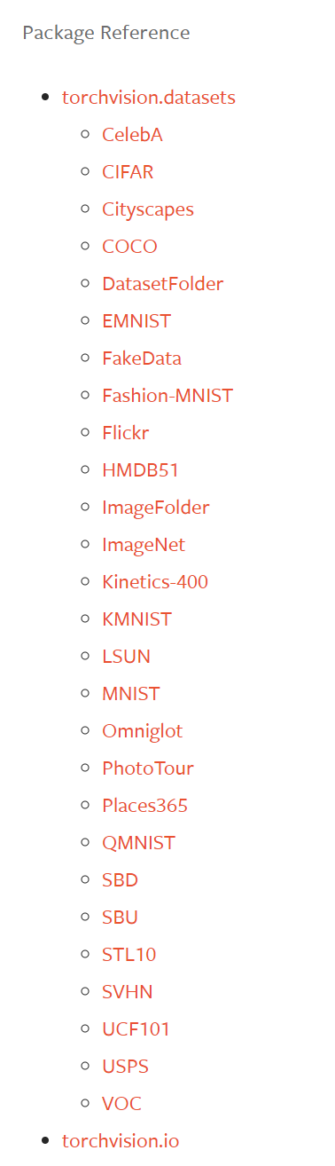 在pytorch的官网上https://pytorch.org/的Docs有torchvision的介绍,介绍了关于pytorch提供的数据集的API文档,新版的pytorch在左上角的Search Docs选择0.9.0版本即可