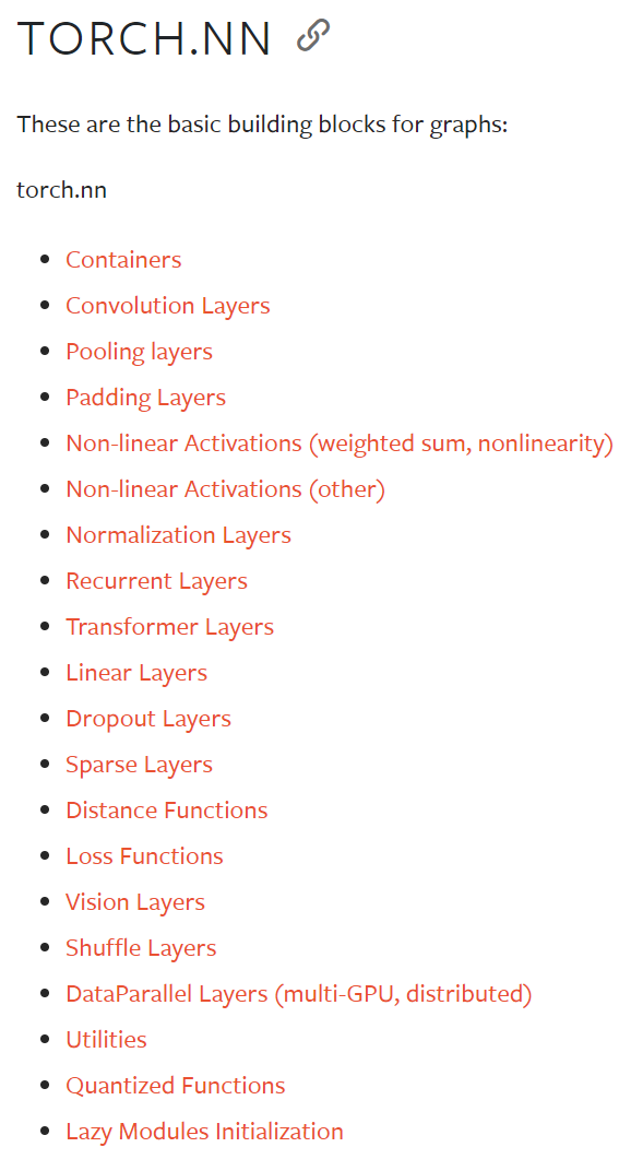 在pytorch的官网给出的Docs找到torch.nn的文档,其中containers直译是容器,在这里是给神经网络定义了一些骨架和结构,只需要往这些结构之中添加一些不同的内容,就可以组成神经网络。后面的一些就是往这个骨架中填充的一些东西,convolution layers(卷积层),pooling layers(池化层),Non-linear Activations (weighted sum, nonlinearity)(非线性激活),Normalization Layers(智能化层)等等,这些共同组成神经网络中的核心操作部分