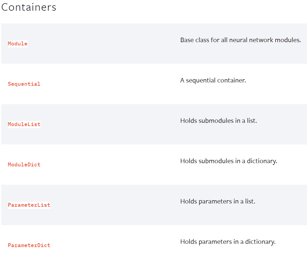在containers中一共有六个模块,其中Module模块是我们最常用的模块,它用来给所有的神经网络提供一个基本的骨架。我们搭建的神经网络,都必须从这个类之中进行继承