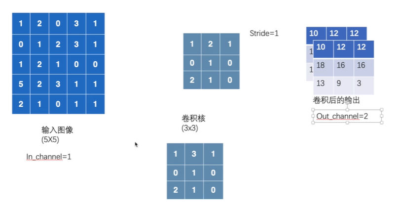 out_channels是2的时候,可能会有两个不同的卷积核对一个in_channels是1的图像进行卷积,能得到两个输出,这样out_channels的值就是2