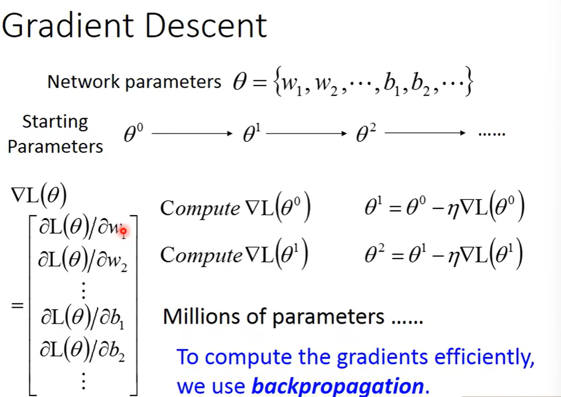 传统的梯度下降的方法,是将所有的参数写在一个θ向量里面,在这个向量里面的参数分别求偏导数,之后再对θ向量进行更新。但是如果在神经网络中,会有很多层,每一层对应也会有很多个参数,于是会让θ向量变得非常长,而我们要做的是如何有效的将这个百万维的参数向量计算出来,而这个就是反向传播在做的事情,他并不是一个和梯度下降不同的计算的方法,他就是梯度下降的方法,只是效率较高,可以更加有效率的把梯度下降需要变化的变量计算出来