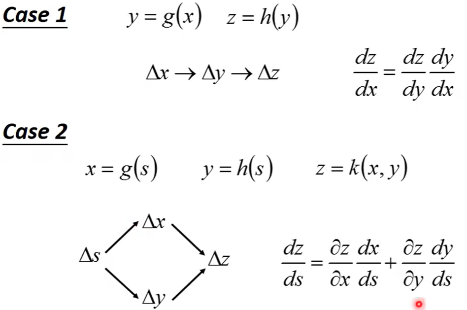 链式法则主要分为两种情况,是在对某个变量进行求导时可以通过中间变量进行求导。