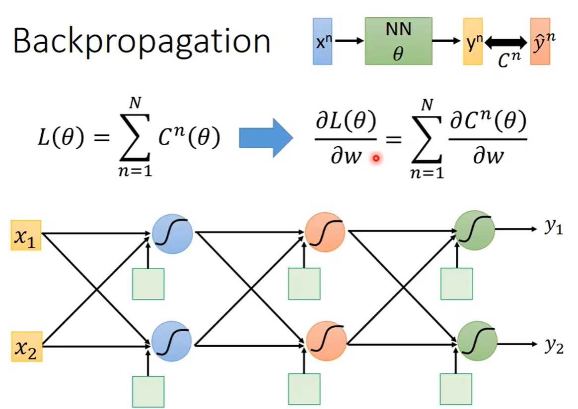 回到我们的反向传播中去,当我们定义了一个loss函数,这个loss函数中的Cn表示给出的预测值和真实值之间的差距,当我们将所有的训练集的数据的Cn进行相加,就可以的得到loss函数,当对loss函数求关于w的偏微分时,可以得到右边式子,至此不需要进行loss函数对w的求导,只需要对一组数据的Cn进行w的求导就可以将所有的相加最后得到Loss函数对w的求导