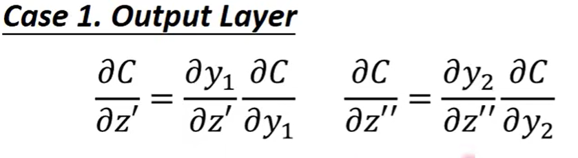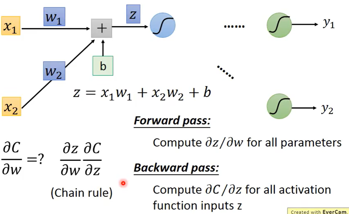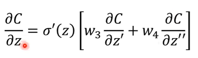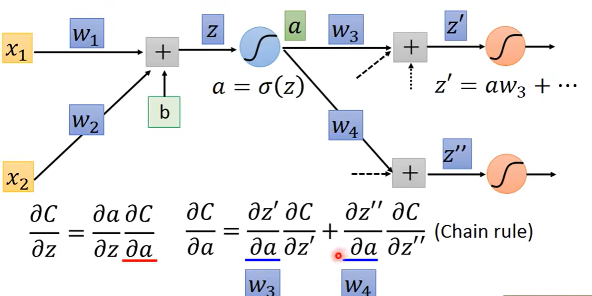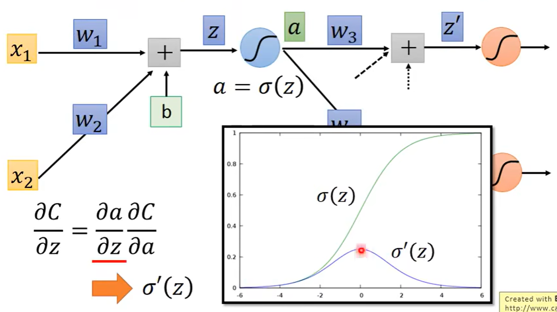 较难的部分是C关于z的偏导数,假设通过这神经元得到的结果是a,之后这个a又乘上相应的权重,加上其他input乘以权重之后又得到了一个新的结果,此时C关于z的偏导数又可以进一步拆解