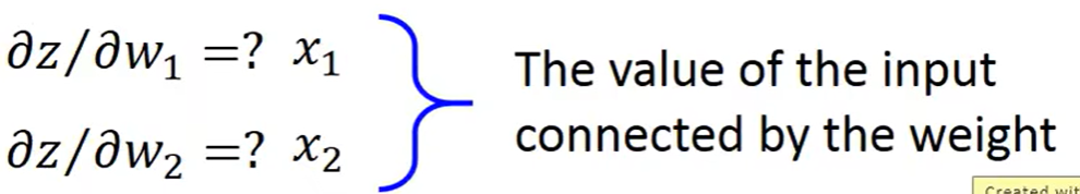 我们可以很轻易地将z对w的求导算出,导数结果就是权重w乘的数据x,也就是w对应的input是什么求导结果就是什么,w1对应x1,w2对应x2