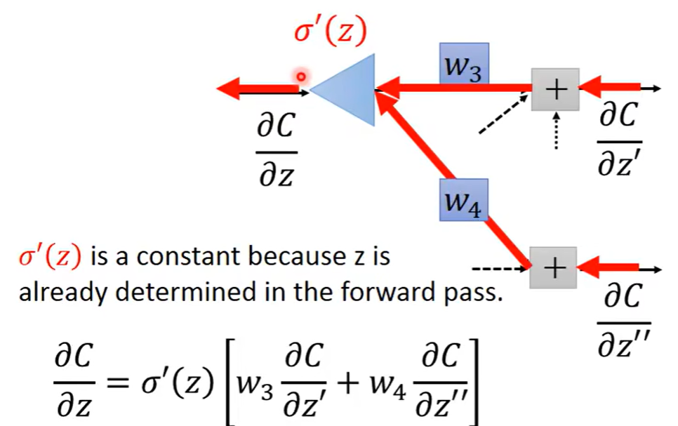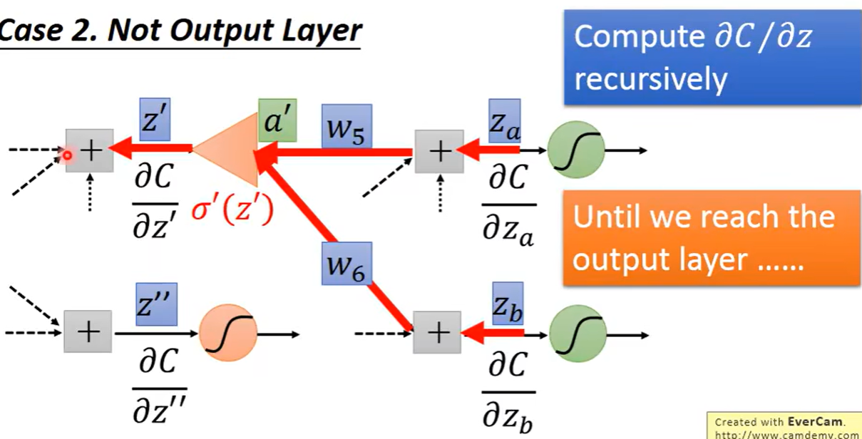 所以可以倒过来推到得到我们想要计算的偏导数,假设有一个神经元,我们可以倒着通过偏导数乘以相应的weight得到这个神经元前一个神经元需要的偏导数