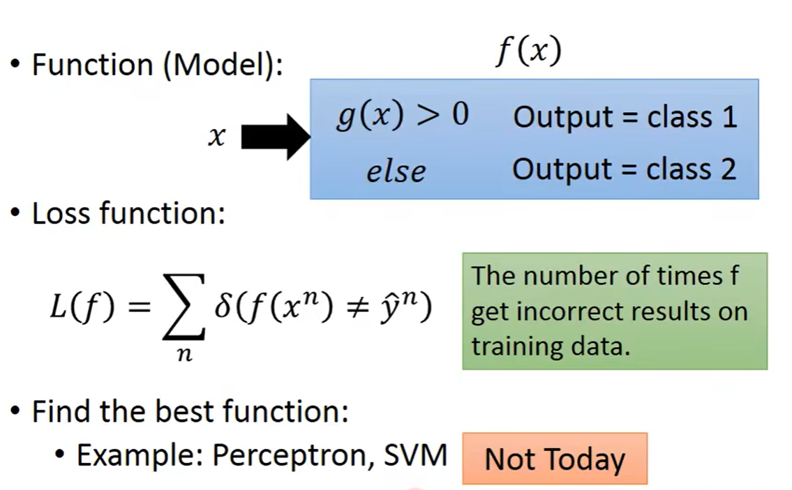 如果按照一贯的三步走的方法,首先确定function,发现可以在f里面内置一个函数g将input放入后如果g>0则输出1,小于零则为1,适应于二分类问题,loss函数也是如果预测分类和真是类别不同则记一个数,否则不计数。
