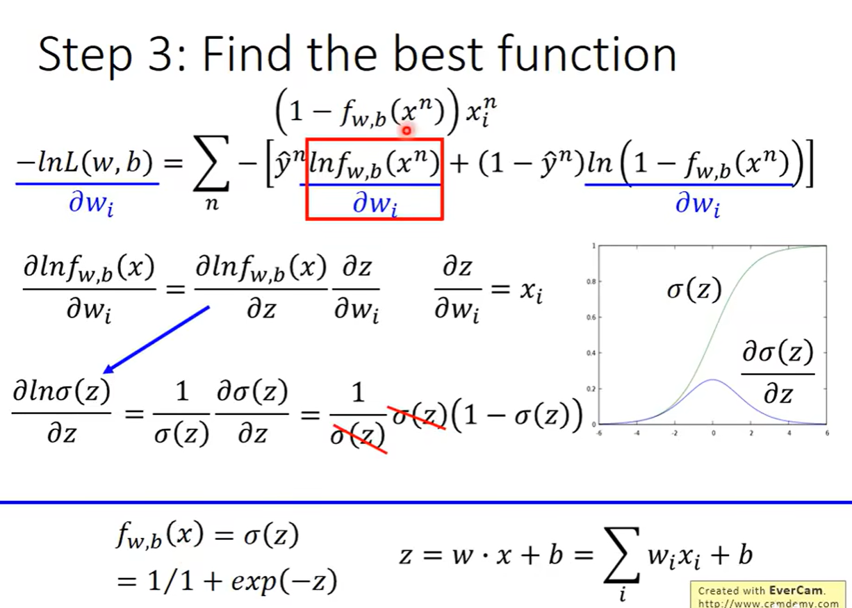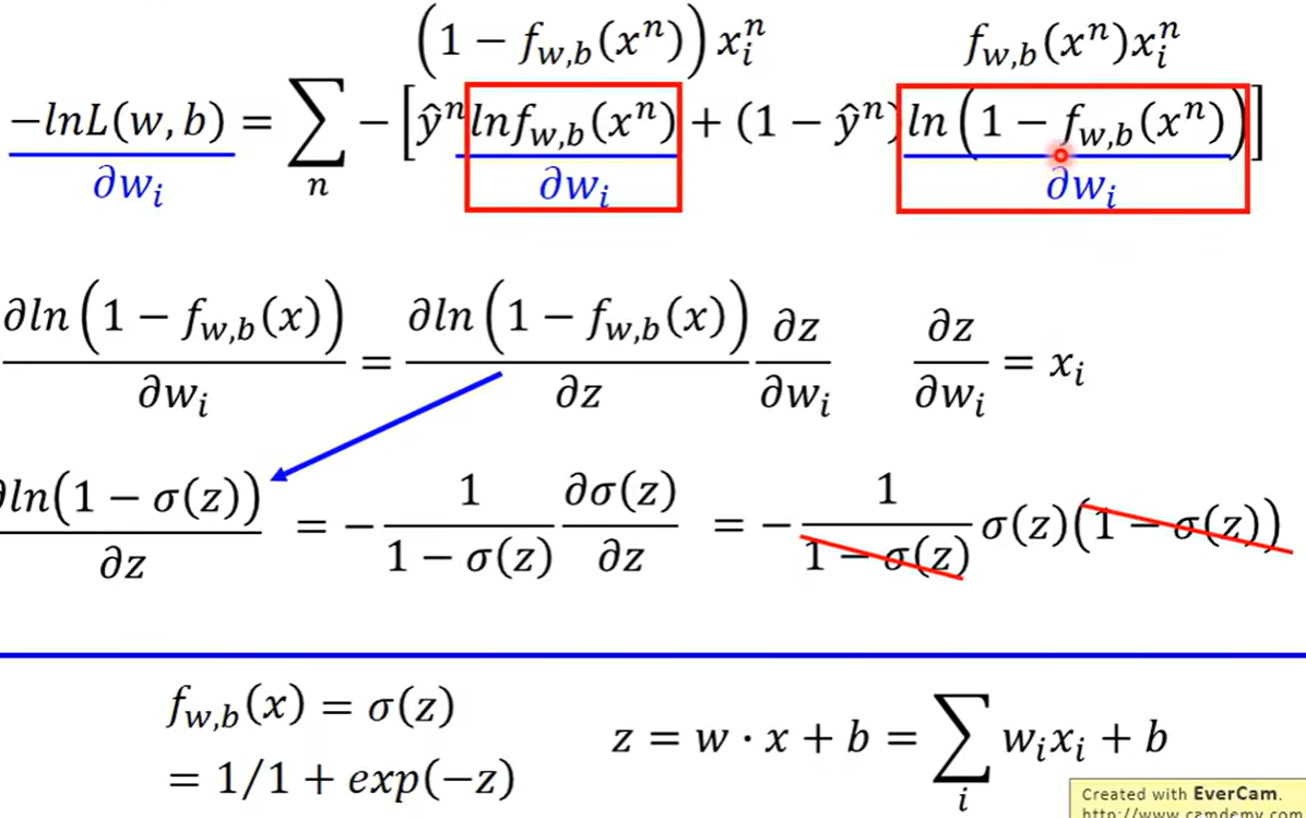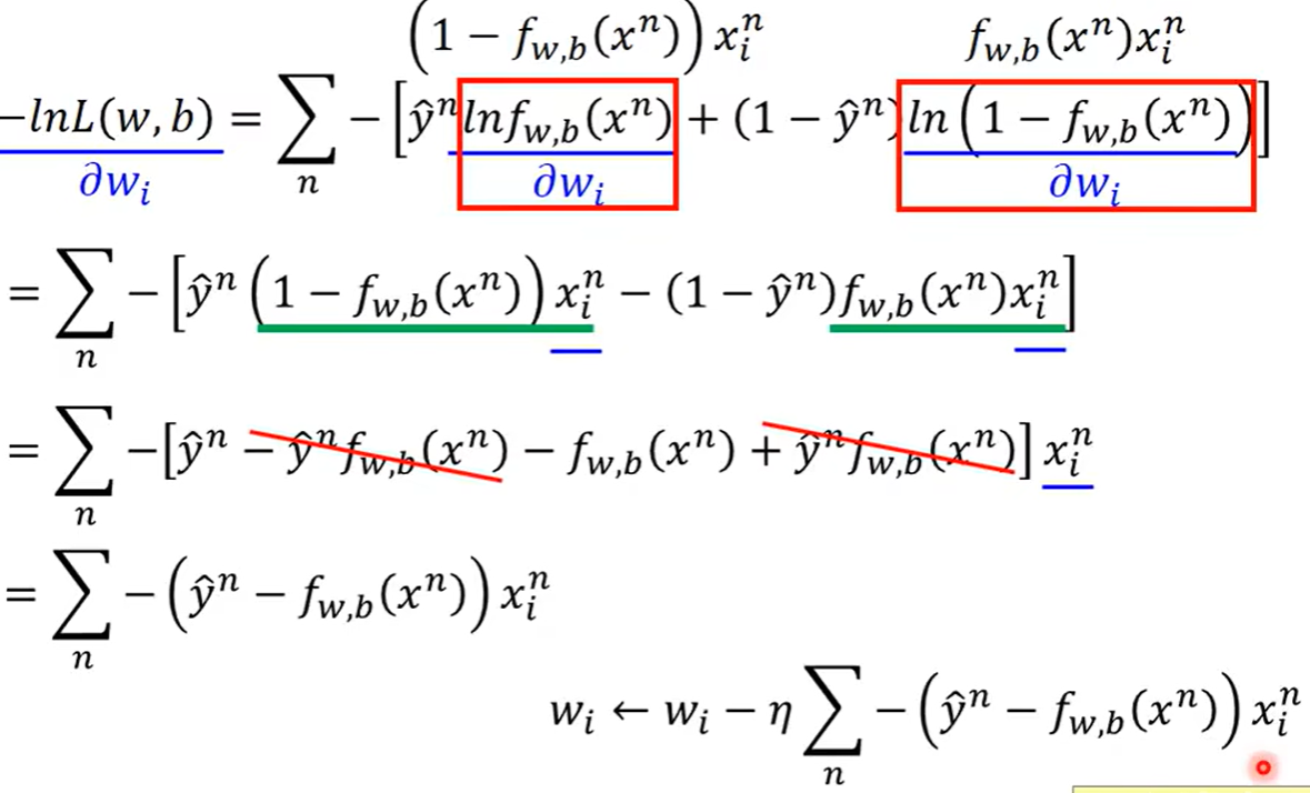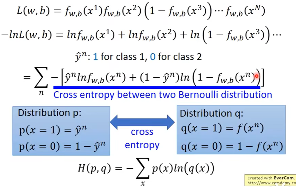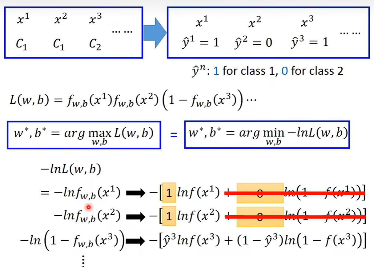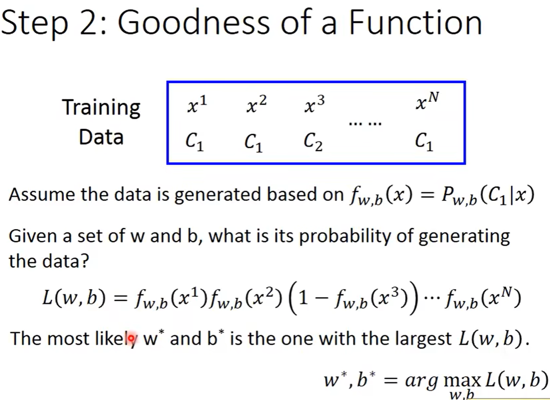加入我们有一个训练集有N个数据,这些数据都被标记好是属于第一类还是第二类,于是我们的L函数就是属于第一类的概率最大化即可,属于第一类的样本点直接用f(x)表示,是与第二类的在L函数里面用1-f(x)表示于是只要找到一组w和b让整个函数最大化即可