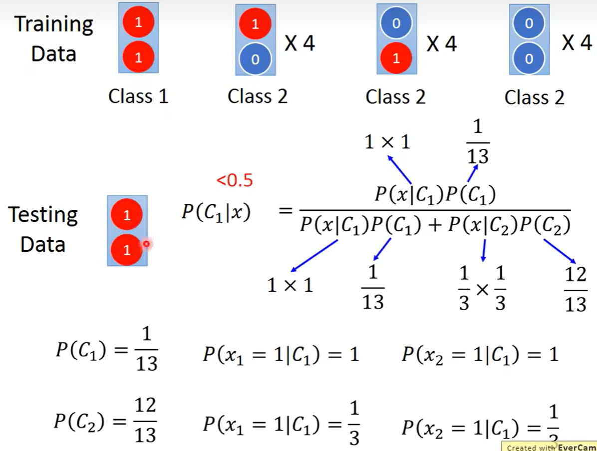 很多文献会说判别器的准确率会高于生成器。原因的话,看下面的例子,这个例子是用生成器来判断检验数据是哪一类别。所得概率居然小于0.5,而实际上人眼判断肯定是class1.为什么会出现这一情况呢?是因为生成器假设这些data来自于一个概率模型,它假设了全1的情况会出现在class2——脑补。而且这个概率也受到data数量的影响。