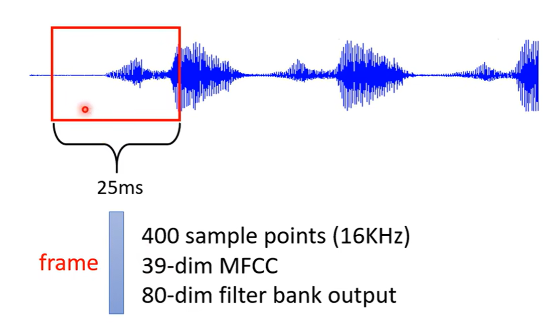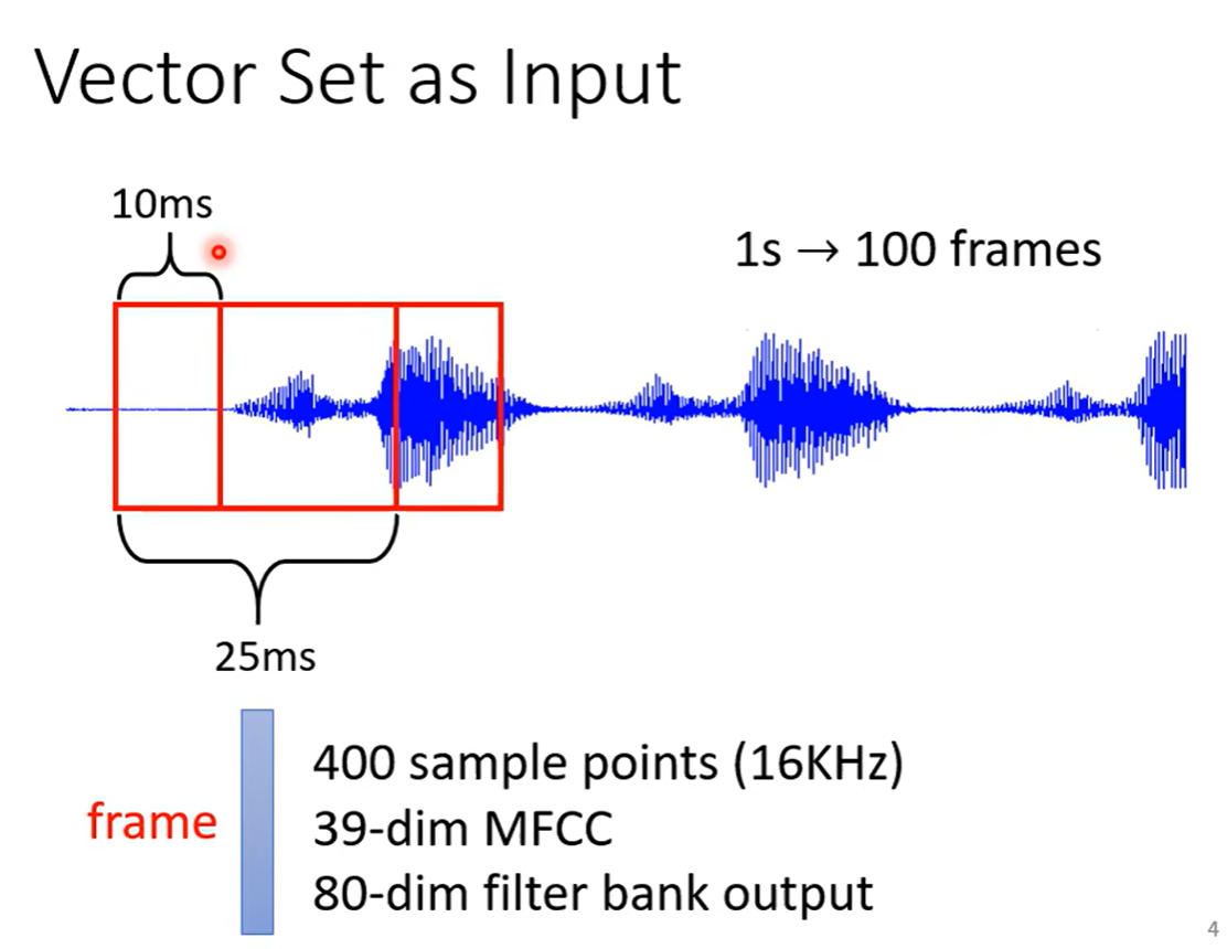 2.再举个例子,一段声音信号其实是一排向量,我们会把一段声音讯号取一个范围,这个范围叫做窗口,这个窗口里面的内容描述成一个向量