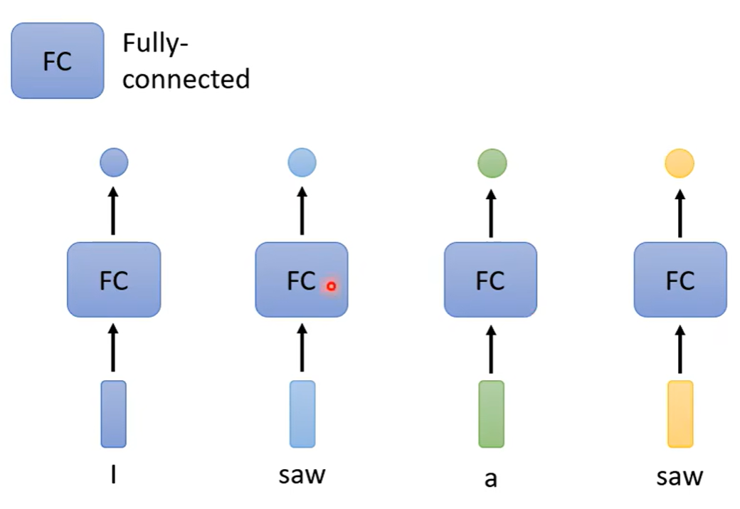 但是这样做的问题也随之体现:比如第一天做的是词性标记的问题,给定了机器上图的句子,两个saw在机器看来是一模一样的两个词,没有理由输出不一样的结果。于是将某个向量以及其前后的向量都串起来,一起丢到全连接层中 ,可以让全连接层考虑到更多的上下文的信息。