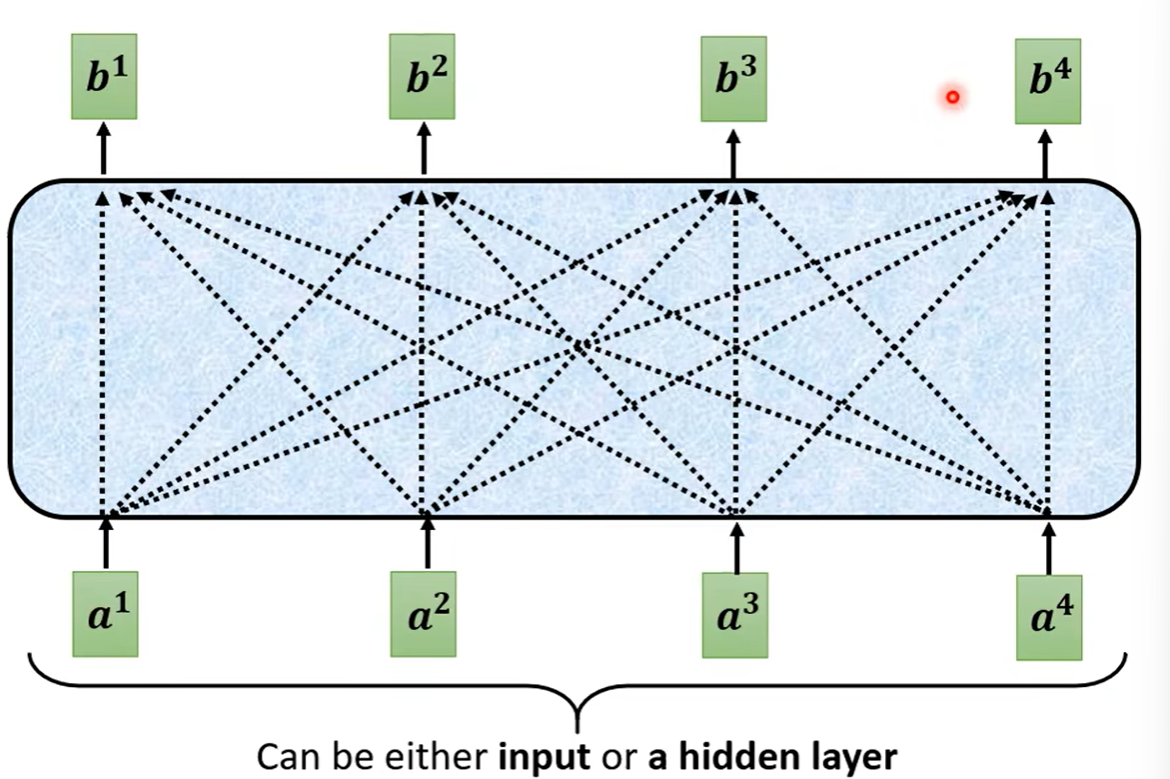 自注意力机制会吃一整个sequence的信息,之后输入几个向量,便输出几个标签。可以看到下图中:输出的四个向量的特别的地方是它们都是考虑了一整个sequence之后才输出的结果,之后再将这个向量丢到全连接层之中,这样一来,这个全连接层中的输入就不是只考虑一个向量,而是间接地通过自注意力机制考虑到了一整个序列的向量。