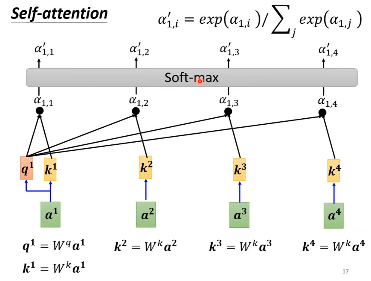 我们先将a1乘上一个矩阵得到q1(名字叫做query),再同样的方法得到k2(名字叫key,由a2乘以矩阵得到)相乘得到α(1,2)(α的名字叫做attention)