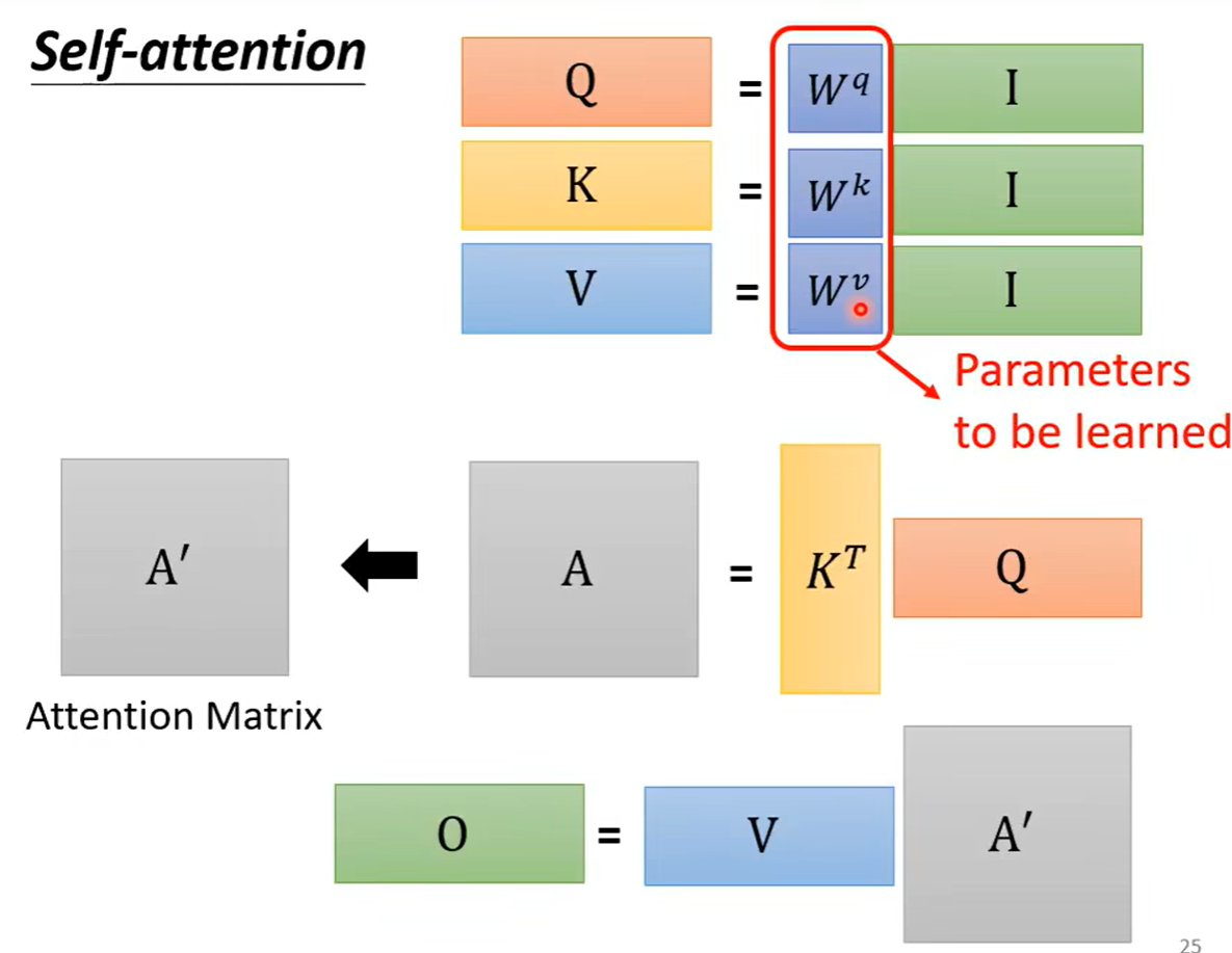 我们知道所有的输入向量都会得到三个向量q,k,v于是使用矩阵运算进行表示是每一个a都乘上Wq这个矩阵,得到四个q ,我们把四个不同的向量看作是一整个矩阵I,得到的结果(也就是q组成的矩阵Q),同理的得到三个矩阵Q,K,V