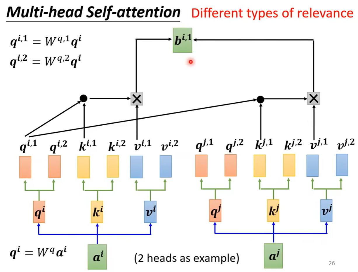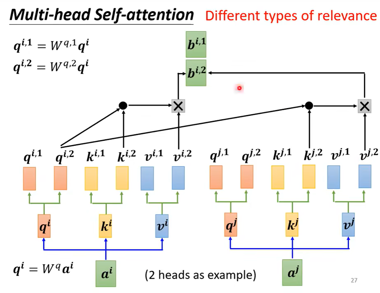 head的数量是可以根据不同的任务进行设置的,在做自注意力机制的处理的时候,我们可以认为在做的是用向量q去寻找与其相关的向量k,但是相关可以有各种类型的相关,于是可以不只有一个q可以有多个q负责不同种类的相关性。于是a可以乘上矩阵得到q,之后q可以再乘上不同矩阵得到不同版本的q。