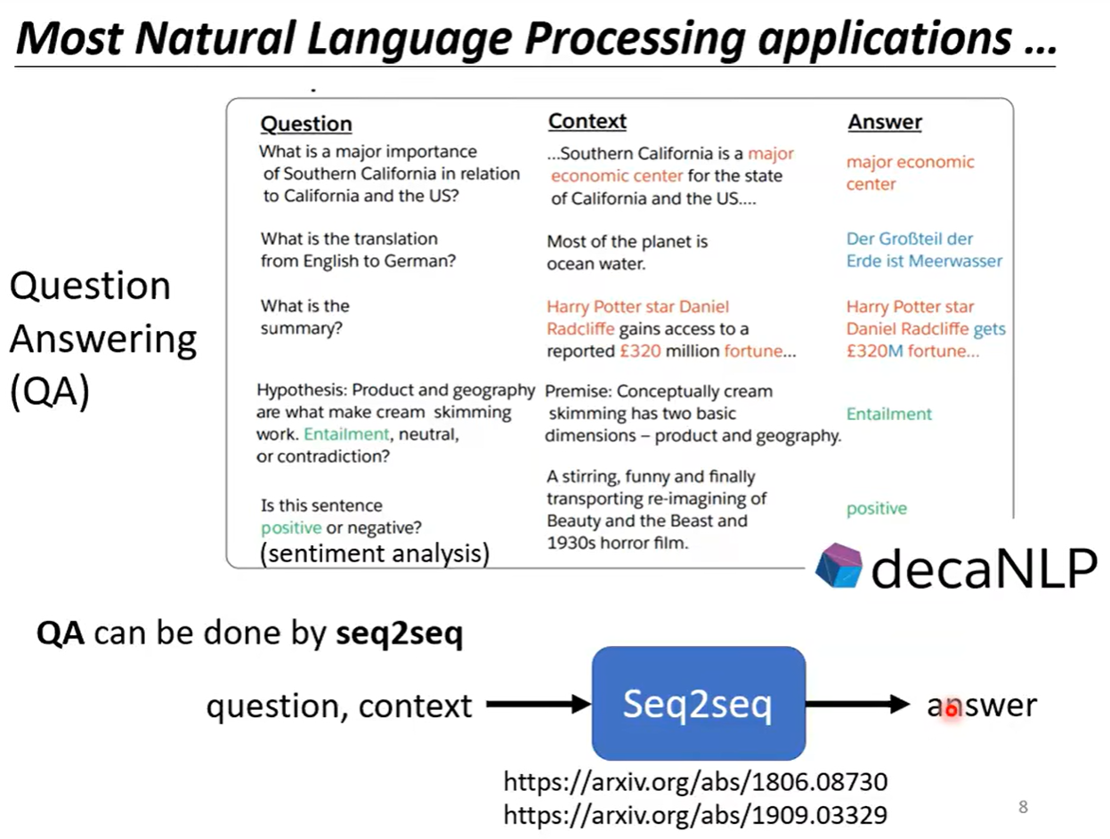 很多种类的NLP的问题都是可以看成QA的问题,而QA的问题都可以用seq2seq的模型来进行解决,但是很多nlp的任务可以通过不同的任务来特定制作模型,效果会更好一些。