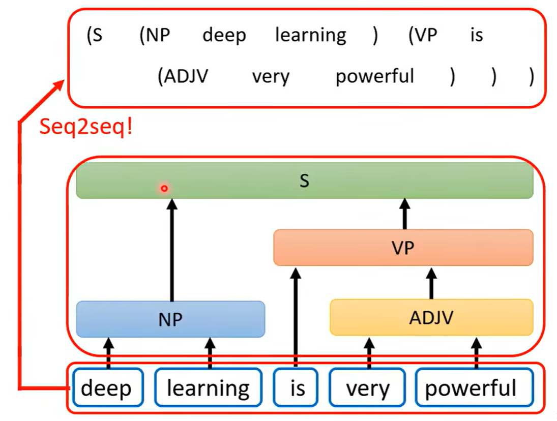 还有一些问题,表面上看并不是seq2seq的问题,但依然是可以使用seq2seq的模型来进行解答,比如文法剖析,可以看到下图中的文法剖析任务中得到的输出是一个树状结构,但树状结构也是可以硬是看作是一个sequence