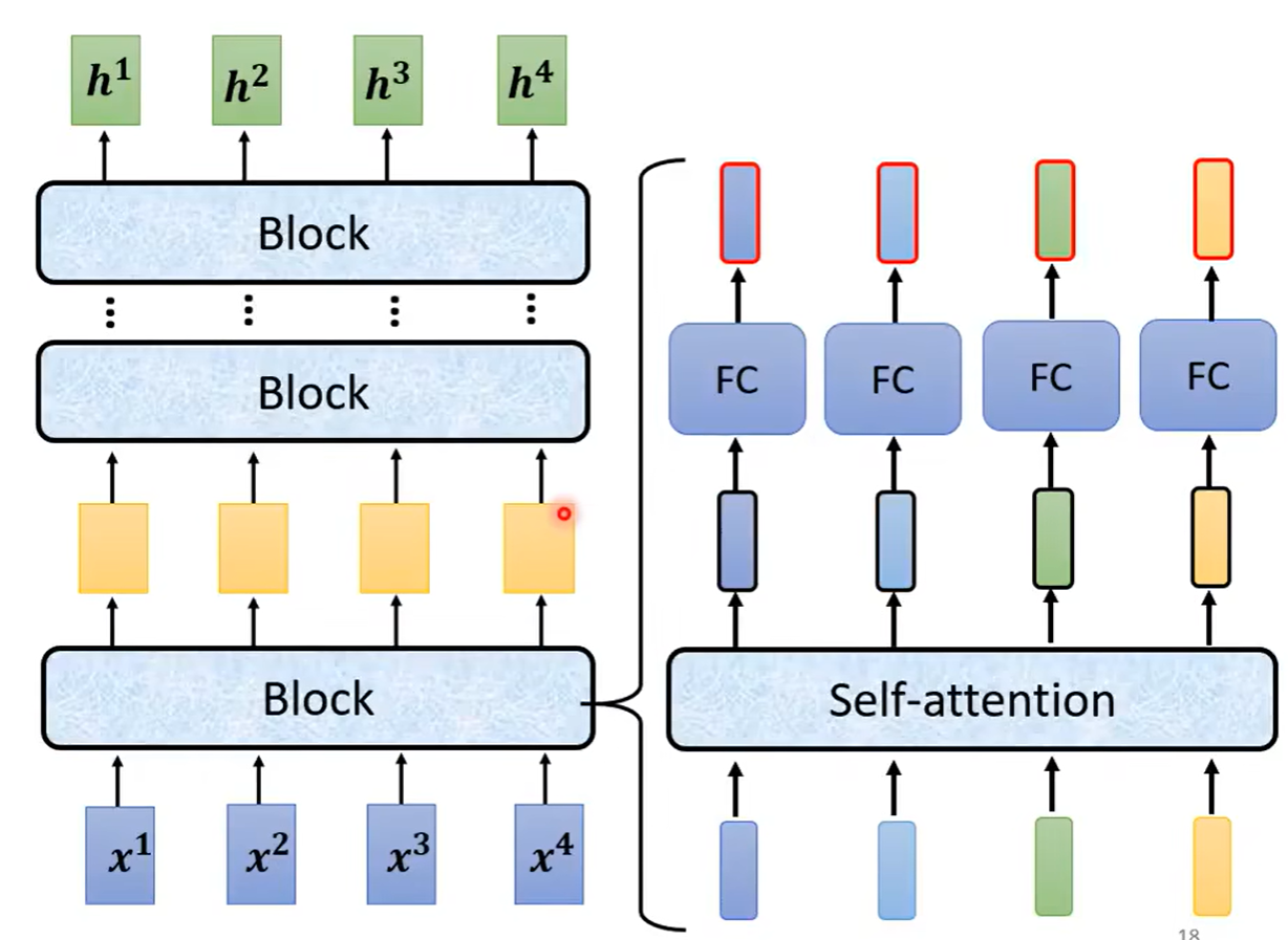 简化一下模型是如下图所示,给定一排向量经过一个block之后输出的向量再进入下一个block,之后经过多个如此循环之后得到最后的向量。但是每个block并不是只做一层做的事情,它先做一个self-attention,之后输出再丢到一个全连接层之中,再输出的一排向量,才是一个block输出的向量