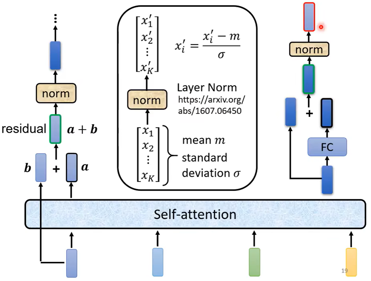 但是在原来的transformer之中,做的事情是更复杂的,每个经历过self-attention的向量都会再加上输入之前的向量,再得到新的输出,之后再进行layer norm(防止梯度消失和特征退化),之后这个标准化的输出才是全连接层的输入,后面全连接层也是有residual的架构(加上input本身),之后再做一次标准化,这个输出才是一个block的输出