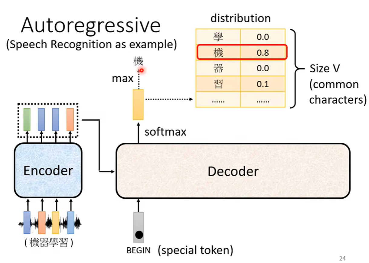 Decoder其实有两种,这里主要介绍常见的Autoregressive,这里使用语音辨识进行举例,语音辨识就是输入一段声音输出一段文字,上面讲的encoder就是把输入的语音向量进行编码之后,输出一排向量,decoder要做的就是encoder的输出先读进去,再产生一段文字。那decoder又是如何产生一段文字呢?