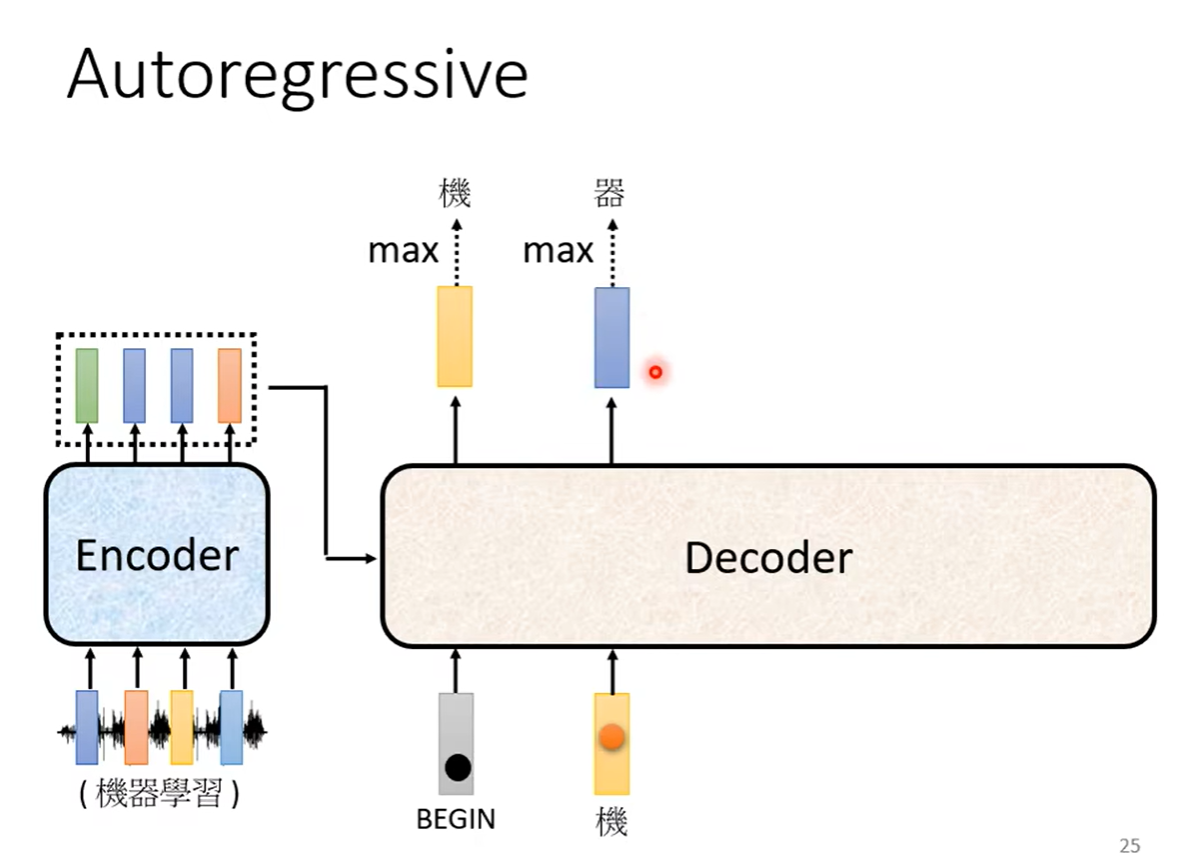 上面介绍了常见的autoregressive,后面介绍不常见的Non-autoregressive。常见的AT可以理解为一个字一个字的产生,而NAT可能是输入一整排的begin的token,一次产生一排的结果。