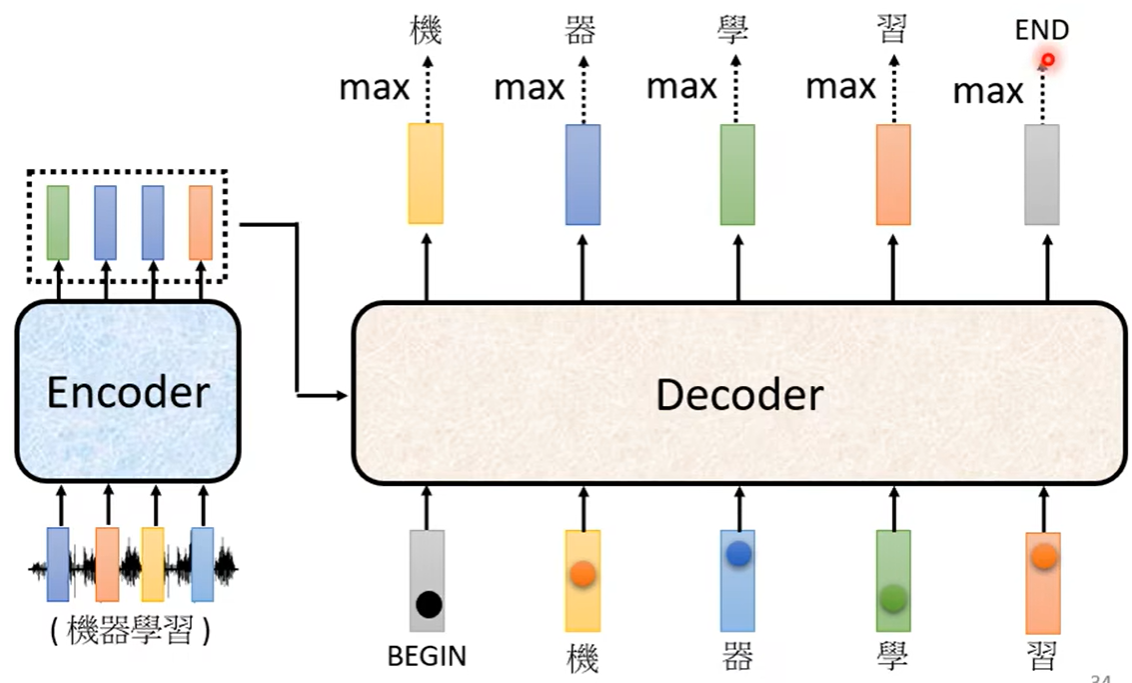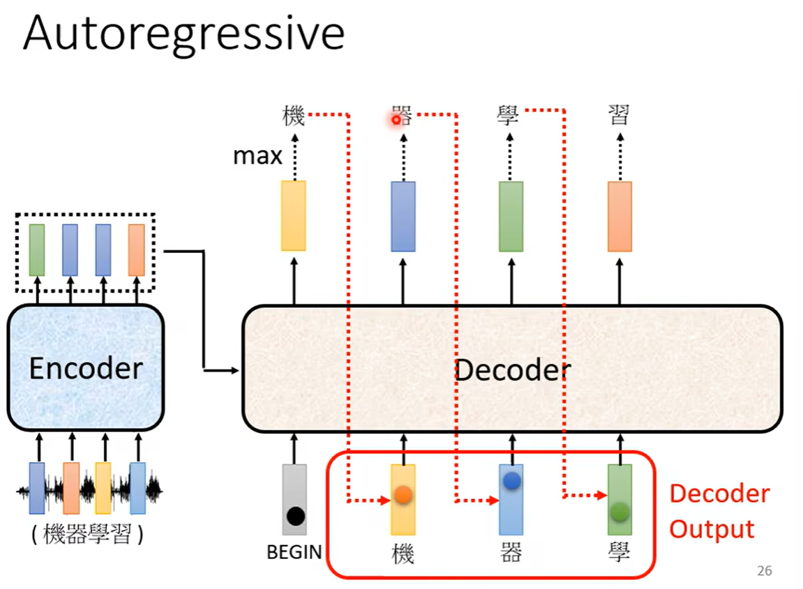 可以看到在这个里面输出的应该是“机”,之后再把这个输出当作decoder新的input,也是把这个字表示成独热向量作为输入,于是此时有两个输入,一个是begin符号一个是机字,根据这两个输入再输出一个向量“器”