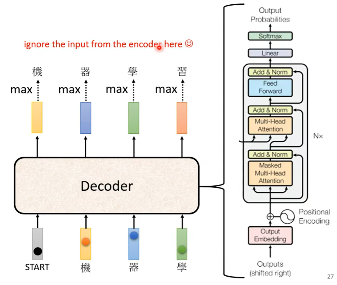 同理继续进行下去,也就是说decoder看到的输入,其实是自己前一个时间点自己的输出