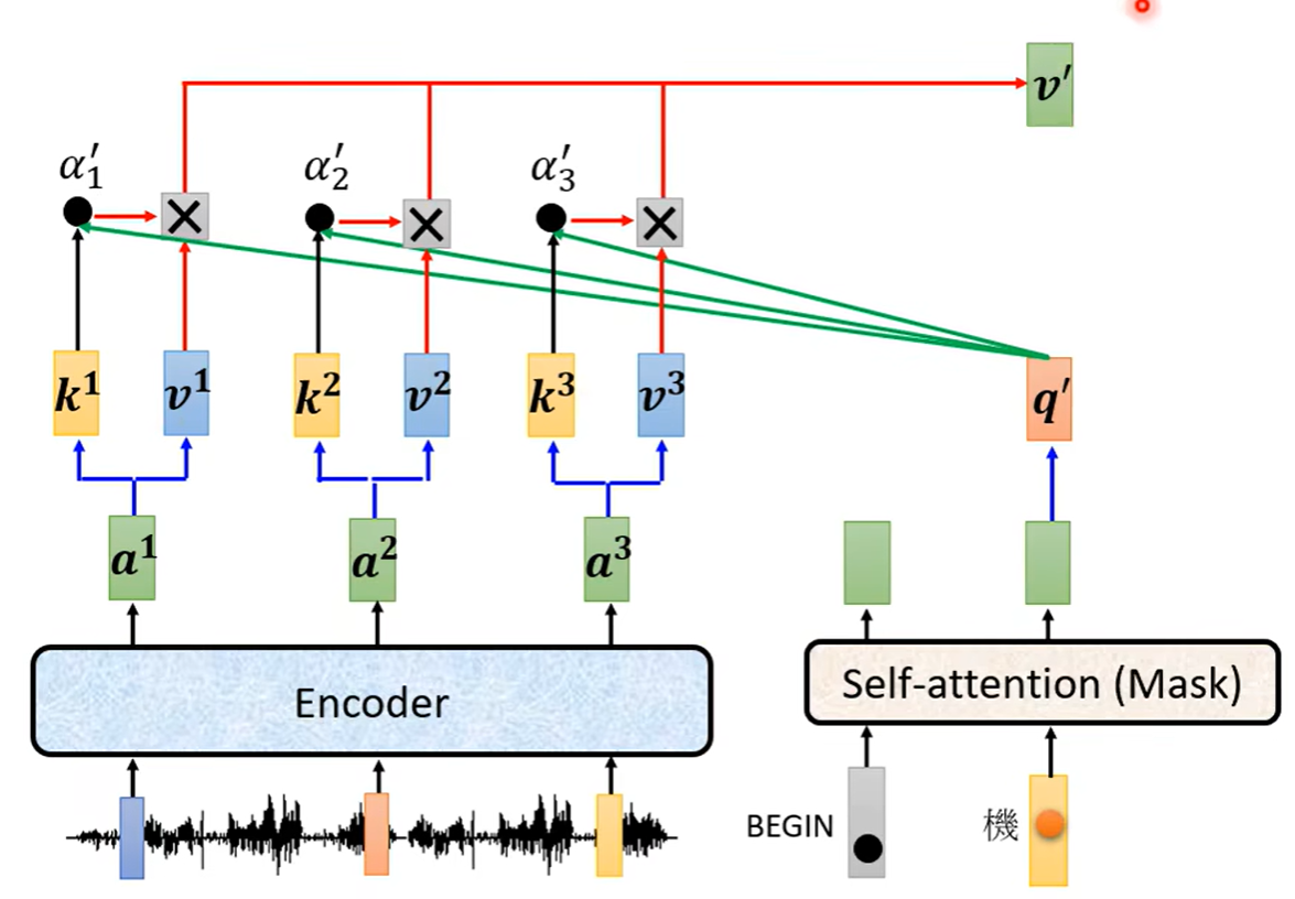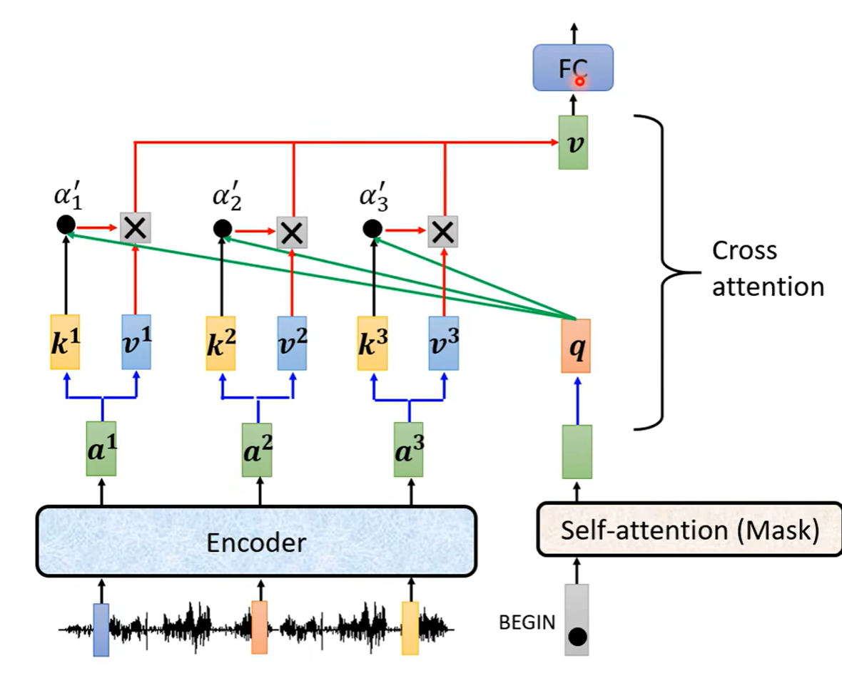 encoder的输出得到的向量a之后乘上矩阵得到k,decoder经过self-attention之后得到向量,在乘上矩阵变成decoder的向量q,再和encoder的k进行点乘得到相关系数α,再把α乘上encoder的向量v1...之后再相加得到向量v,之后这个v再做全连接层的处理。上述这个步骤如下图所示,其中k和v来自于encoder,q来自于decoder。这个过程叫做Cross attention