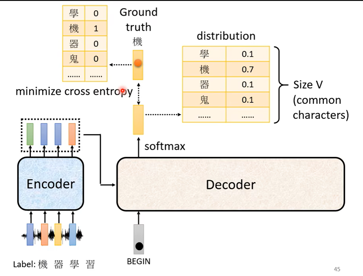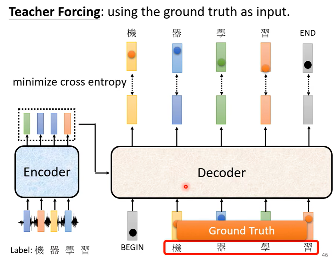 我们产生了几个向量(包含end),就要计算几个向量产生的误差的总和,并使其最小。decoder训练的时候,我们会把上一个正确的答案作为下一个输出,这个过程叫做teacher forcing,但是我们并不知道这个输入是不是正确的答案,所以这中间也有一个误差。