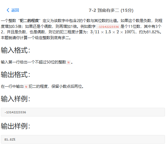 1 #include<iostream> 2 #include<cstdio> 3 #include<cmath> 4 #include<cstring> 5 #include<algorithm> 6 #include<map> 7 #include<set> 8 #include<queue> 9 using namespace std; 10 int main(){ 11 char s[100]; 12 scanf("%s",&s); 13 int sum=0; 14 int n=strlen(s); 15 for(int i=0;i<n;i++){ 16 if(s[i]=='2'){ 17 sum++; 18 } 19 } 20 double t=sum*1.0/n; 21 22 if(s[0]=='-'){ 23 t=(sum)*1.0/(n-1); 24 t*=1.5; 25 } 26 27 if((s[n-1]-'0')%2==0){ 28 t*=2; 29 } 30 char ss='%'; 31 printf("%.2f",t*100); 32 printf("%c",ss); 33 }