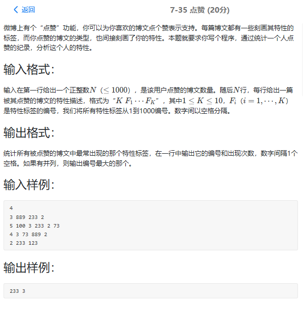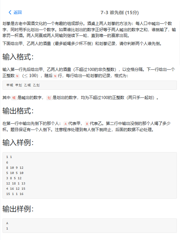 感受:题目本身不是很难,也没有太细节的东西,就是需要注意一下,如果有了结果,下面的数据就不用再读,自己测试的时候,要一个个的把样例敲进去才会有结果,如果变量不是很清楚的话,就要用注释标记一下,一定先想好具体怎么做,方向在哪再动手,不然很容易混淆变量,而且也写不好代码