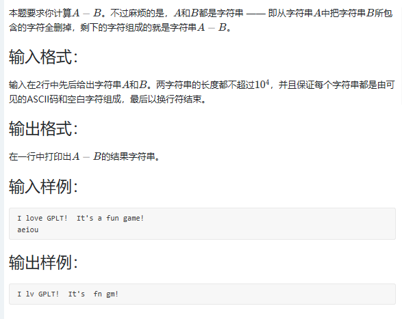 1 #include<iostream> 2 #include<cstdio> 3 #include<cmath> 4 #include<cstring> 5 #include<algorithm> 6 using namespace std; 7 const int maxx=1e5+2; 8 int main(){ 9 string a,b; 10 getline(cin,a); 11 getline(cin,b); 12 int n1=a.size(); 13 int n2=b.size(); 14 for(int i=0;i<n1;i++){ 15 int flag=0; 16 for(int j=0;j<n2;j++){ 17 if(a[i]==b[j]){ 18 flag=1; 19 continue; 20 } 21 } 22 if(flag==0){ 23 printf("%c",a[i]); 24 } 25 } 26 27 }